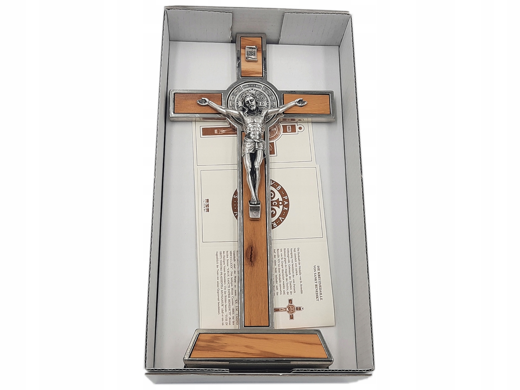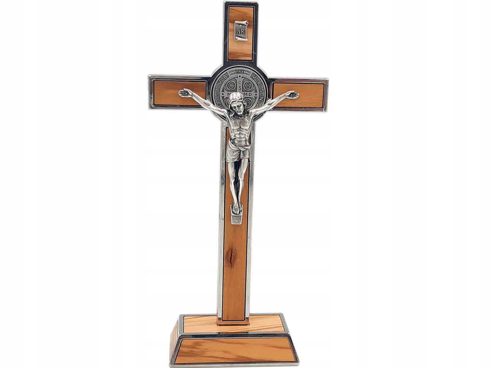 Дуже точно виготовлений хрест із медальйоном (двостороннім) св. Бенедикт. Виріб виконано з поєднання оливкового дерева та металевих елементів сріблястого кольору.