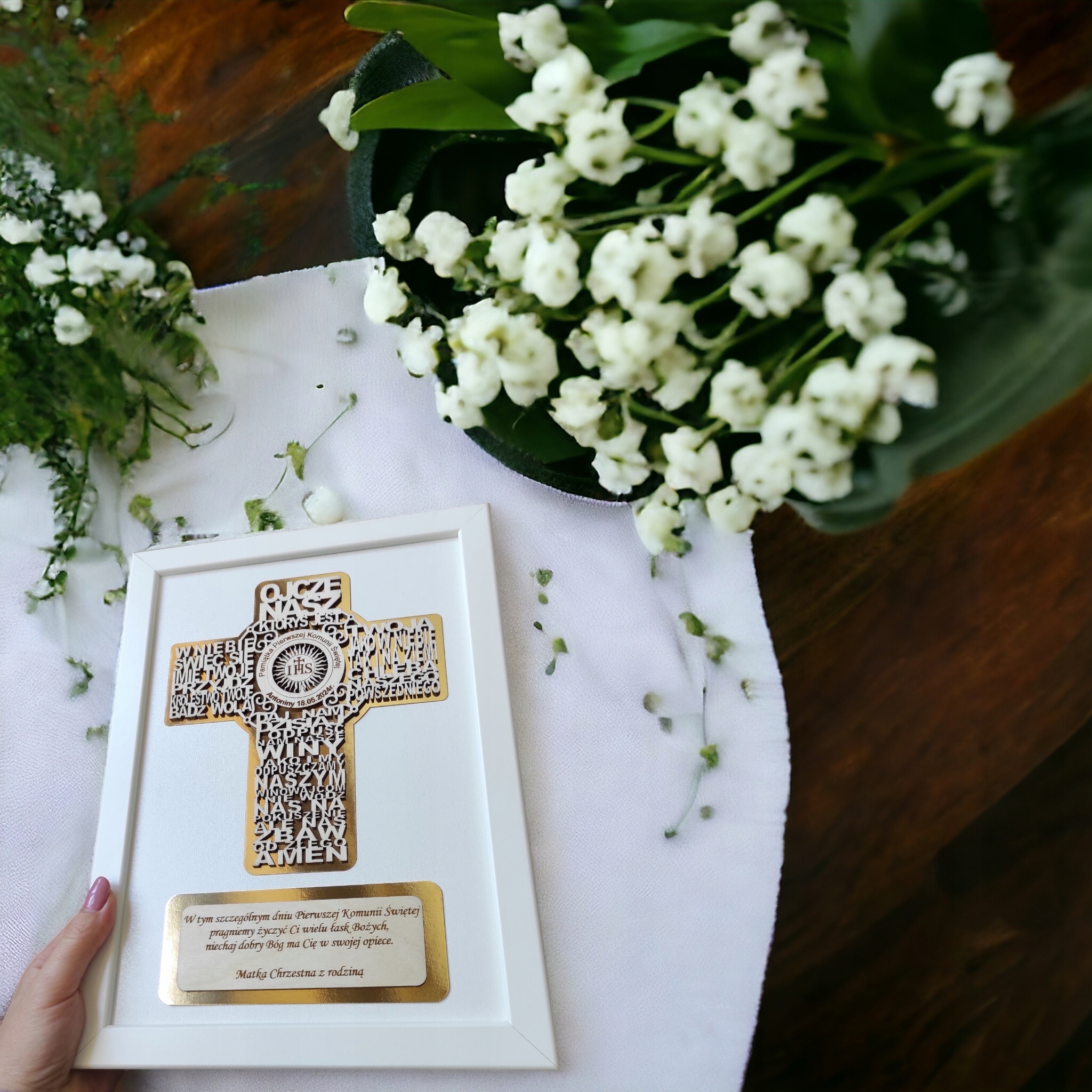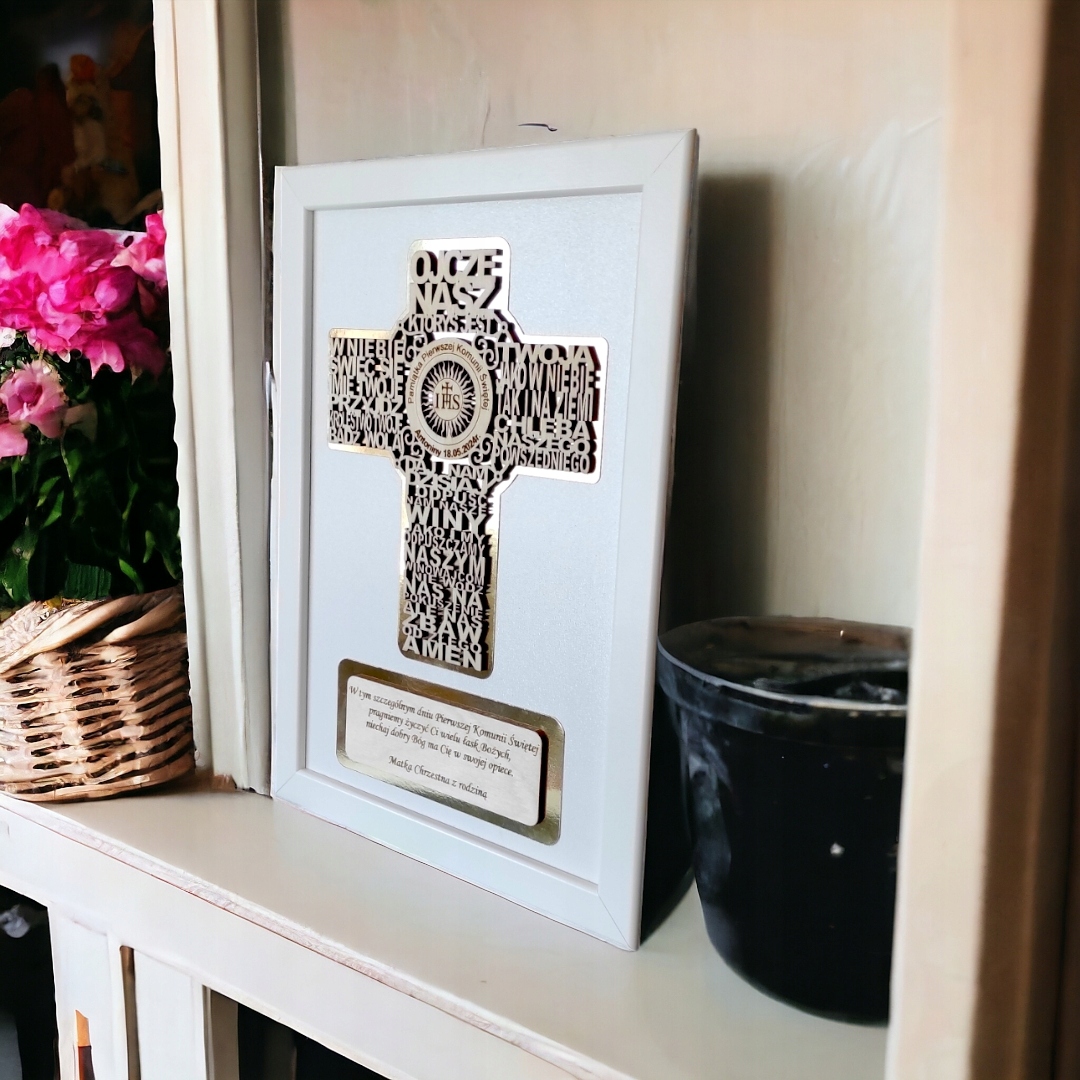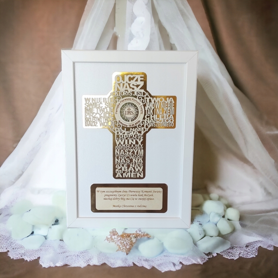 - хрестик з молитвою та персоналізацією є вирізана лазером з фанери товщиною 3мм та розміщена на золотій дзеркальній основі, що дає гарний ефект