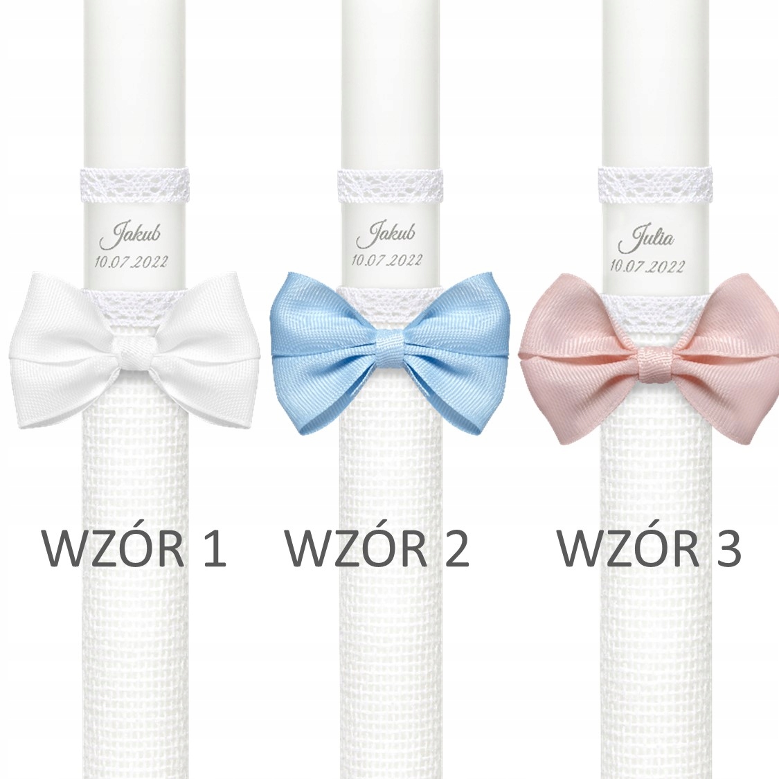 Елегантна біла свічка прикрашена унікальними елементами: бавовняним мереживом і бантом ручної роботи. Свічка персоналізована: ім'я дитини та дата свята.