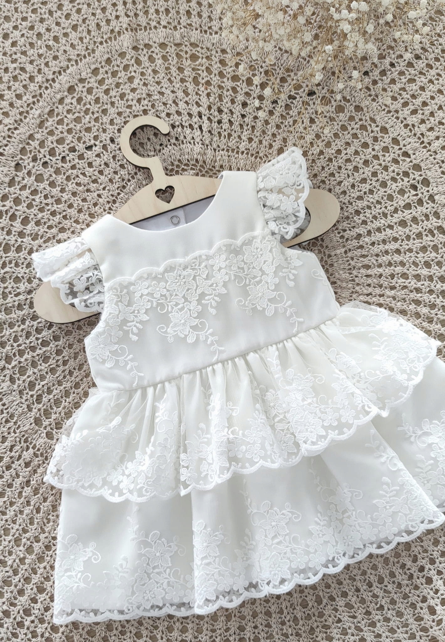 Сукня для хрещення з елегантної тканини без зморшок, оздоблена вишуканим мереживом схожого відтінку до сукні