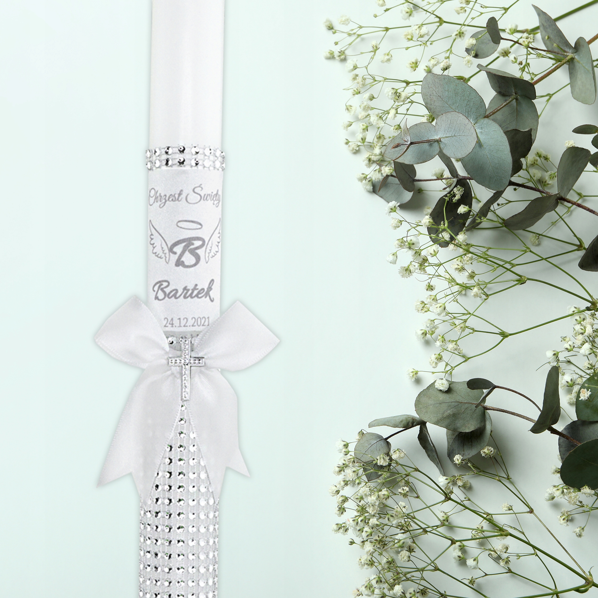 Ми створили ДІАМАНТОВУ КОЛЕКЦІЮ для клієнтів, які шукають чарівну свічку, повну блиску та елегантності. Прикрашена вручну свічка з ім'ям дитини та датою свята. Прикрашена таким чином свічка стане чудовим елементом фото з церемонії та чудовим сувеніром про цей особливий день.