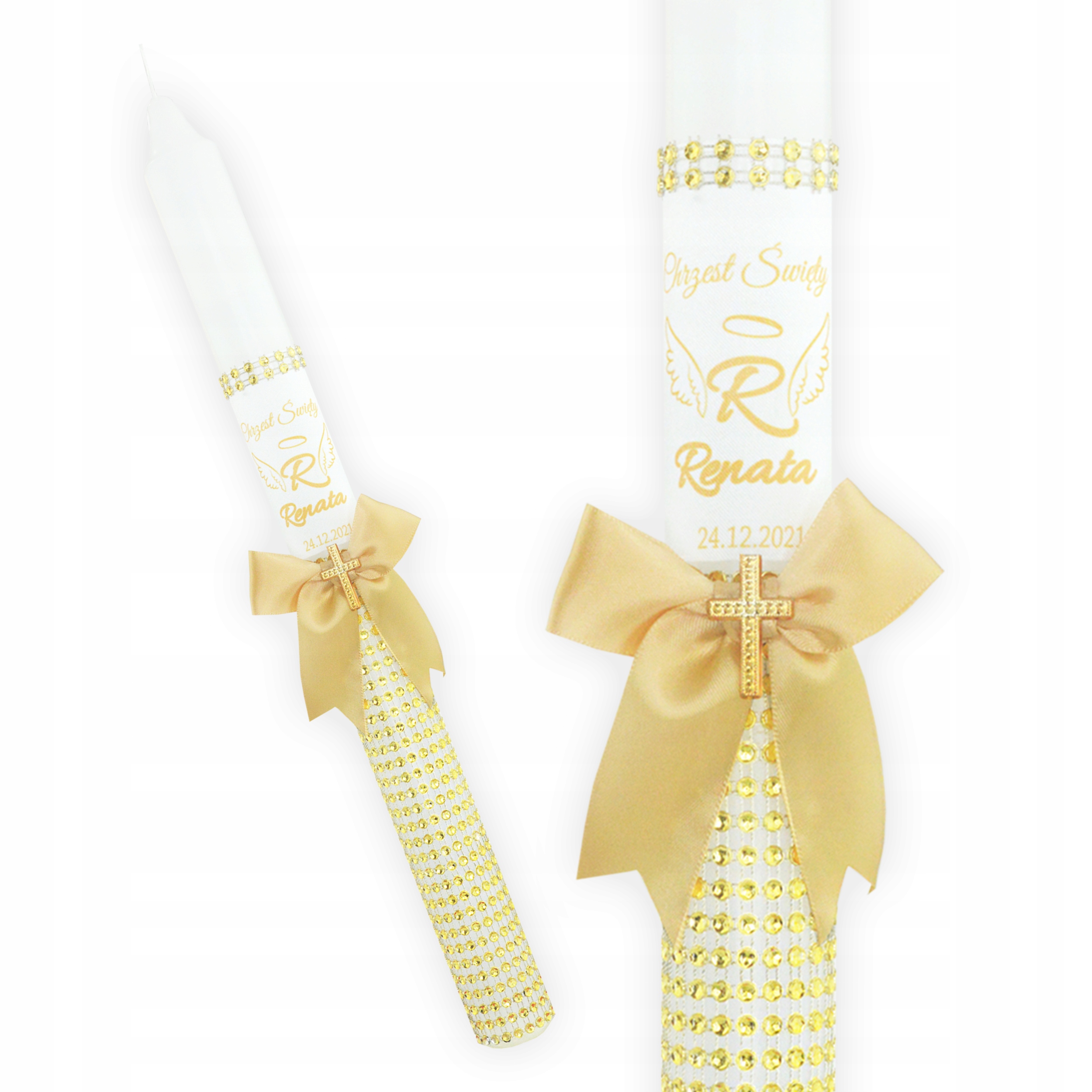 - це свічка, прикрашена золотим матеріалом, що імітує циркони, з атласним бантом ручної роботи, прикрашеним витонченим золотим хрестом.