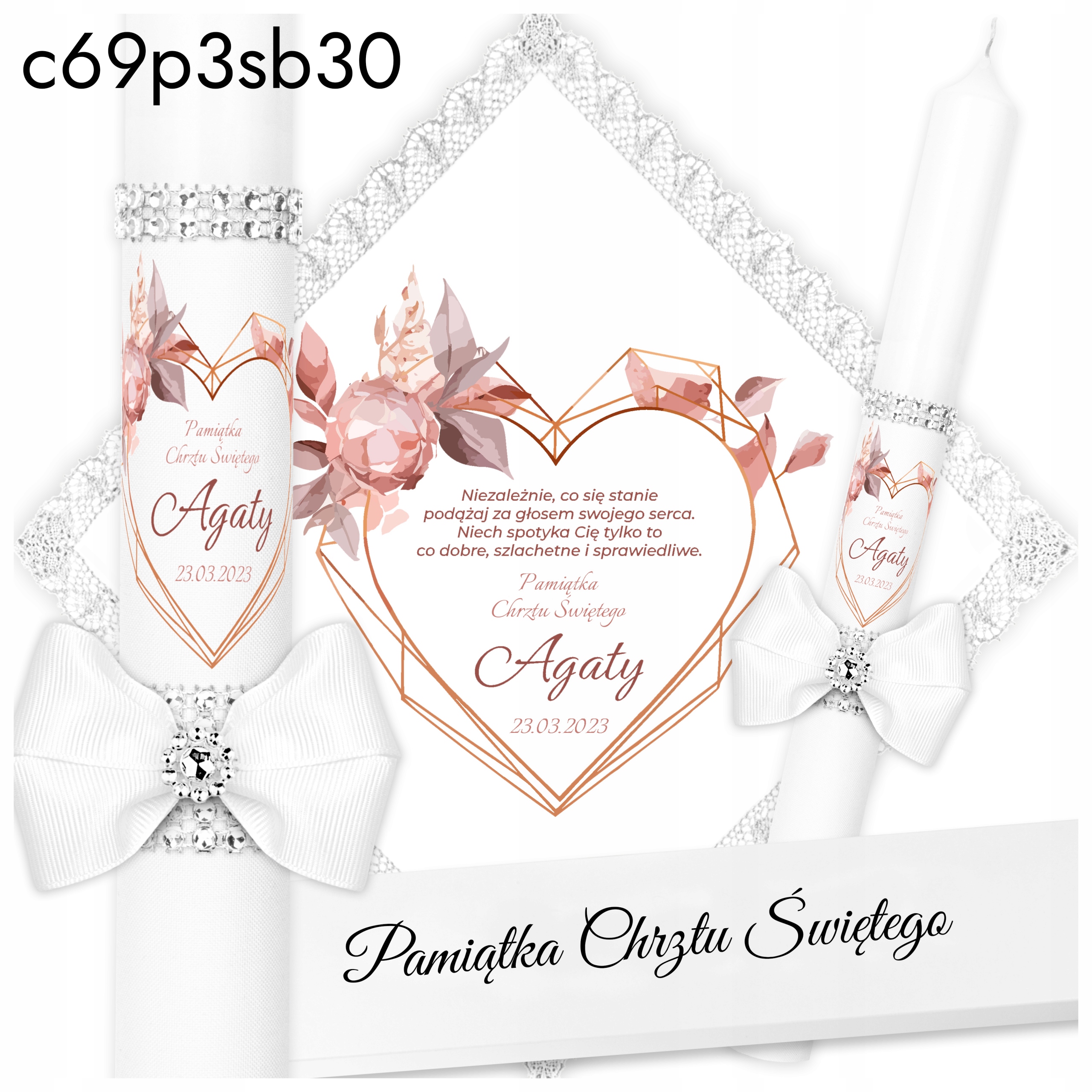 - обгортка атласним матеріалом з декоративним елементом, ім'я дитини та дата хрещення.