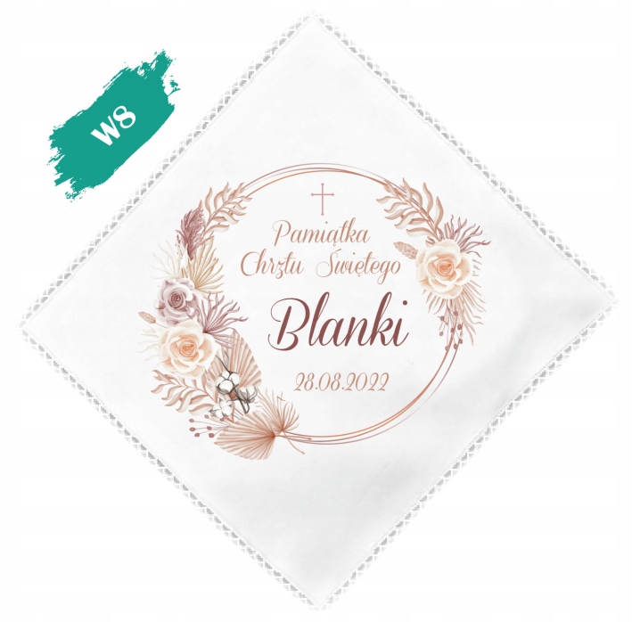 На вибір. з 8 візерунків з красивими мотивами вінка. Кожен халат персоналізовано з ІМЕНЕМ ДИТИНИ та ДАТОЮ ХРЕЩЕННЯ.