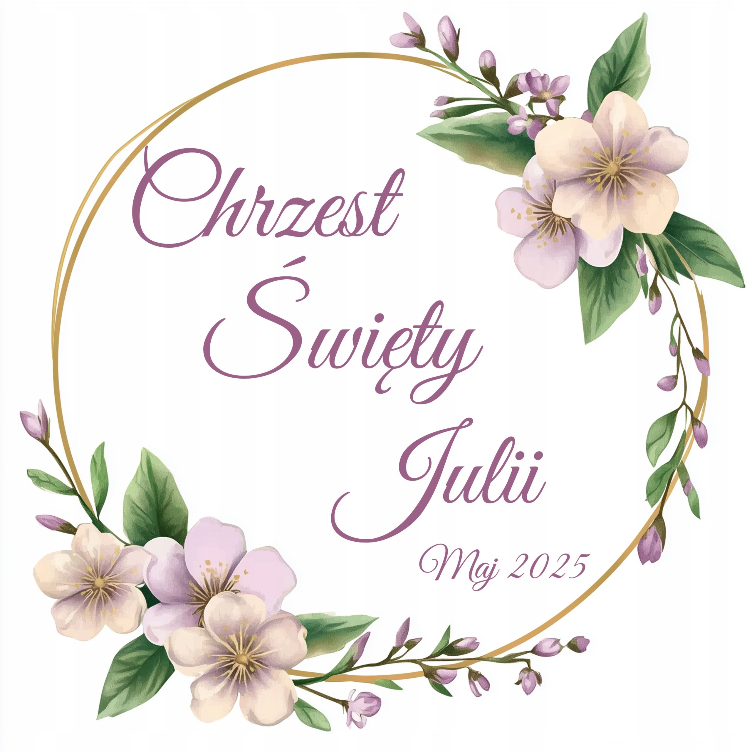 - Візерунок: золоте коло, прикрашене квітами, ім’я та дата хрещення на ваш вибір.