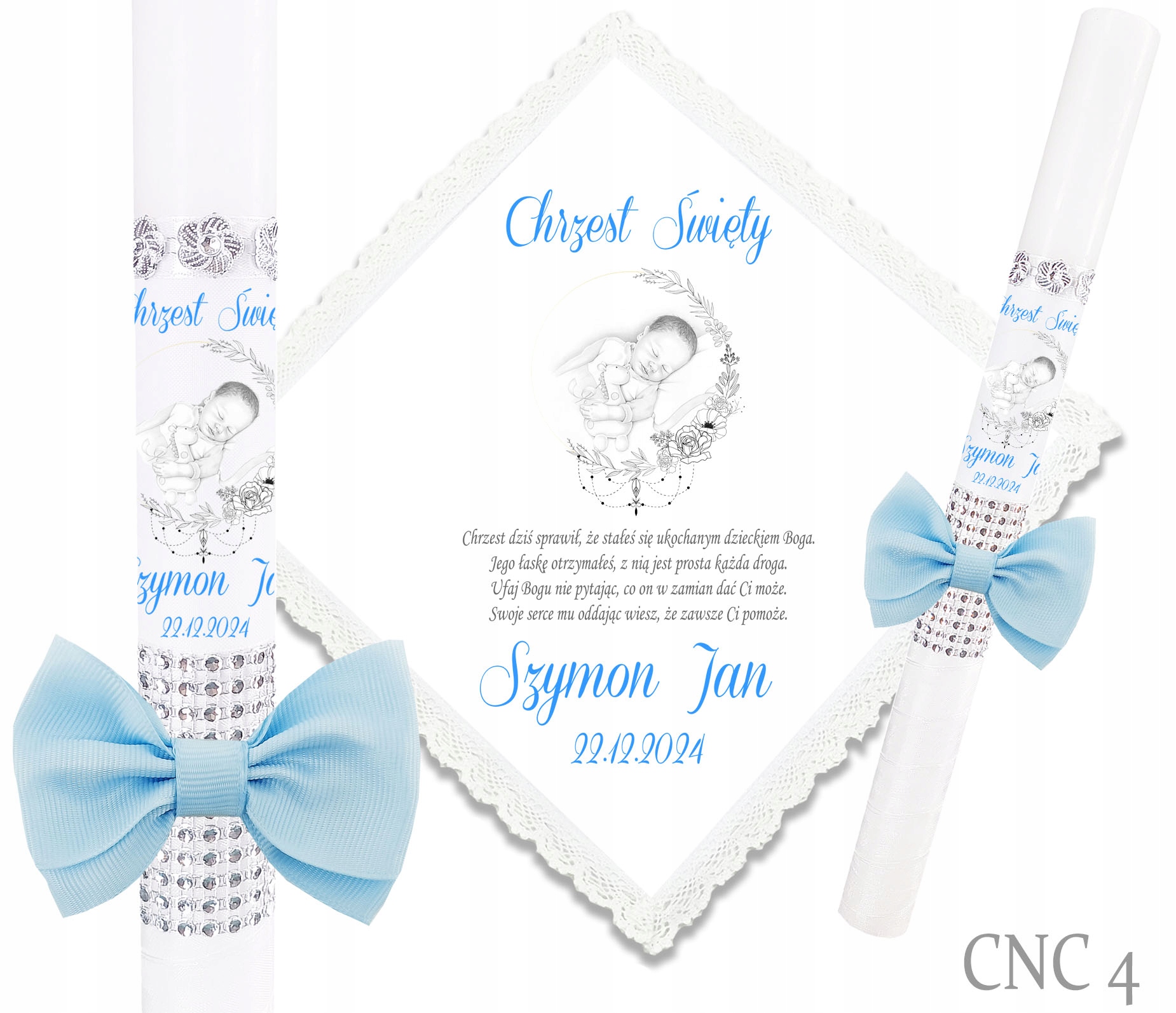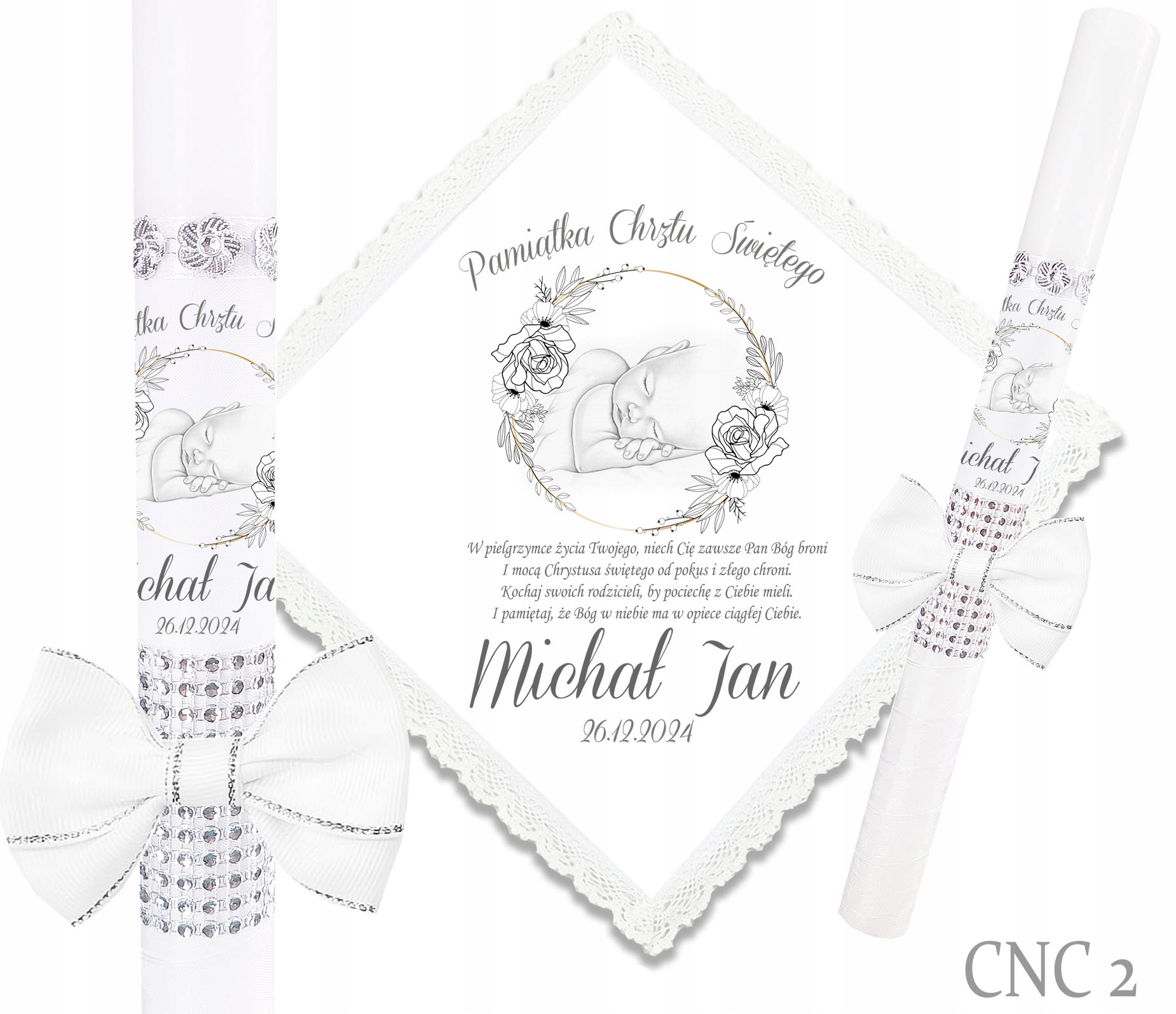 Представляємо надзвичайний набір для хрещення, що складається з мантії та свічки, ідеальний вибір для батьків, які хочуть відзначити цей особливий день вишукано та незабутньо. Свічка прикрашена білою шифоновою стрічкою, що додає їй неповторний характер і шарм. Також свічка має декор у вигляді срібних цирконів, які чудово виблискують. Розкішний бант доповнює елегантність всього комплекту.