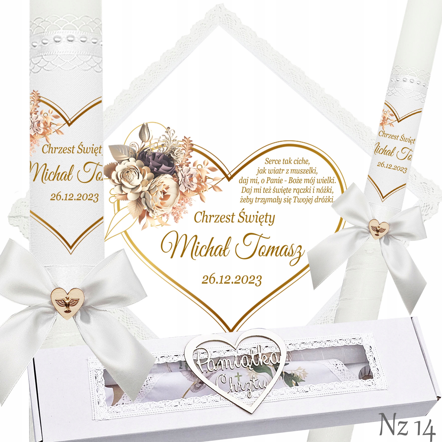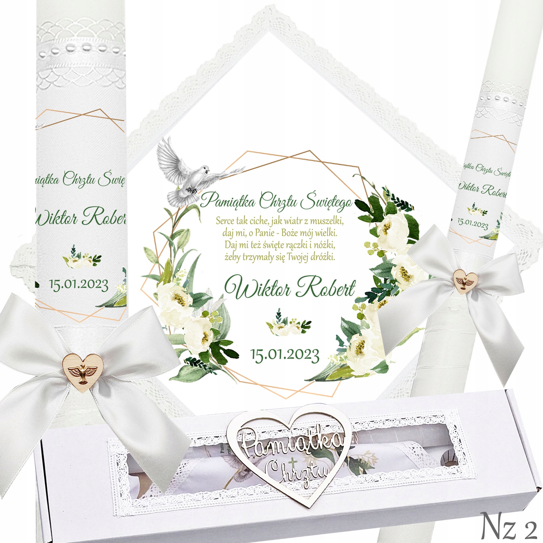 Представляємо надзвичайний набір для хрещення, що складається з ризи та свічки, ідеальний вибір для батьків які хочуть відсвяткувати цей особливий день елегантно та незабутньо. Свічка прикрашена білою шифоновою стрічкою, що додає їй неповторний характер і шарм. Верх свічки прикрашений атласним мереживом і білими перлами, що надає їй елегантності та шику. Лук з дерев'яним серцем і металевою золотою емблемою Святого Духа. додає чарівності та сентиментальності. Все було запаковано в декоративну коробку, яка дозволяє зберігати ці незвичайні сувеніри.