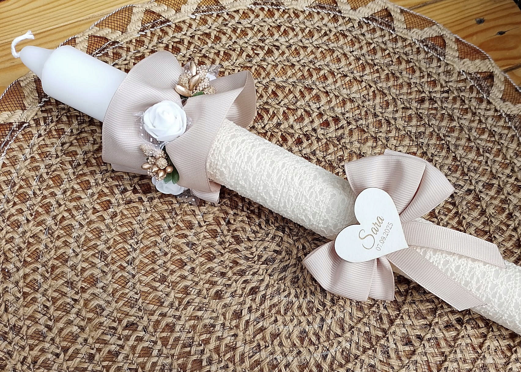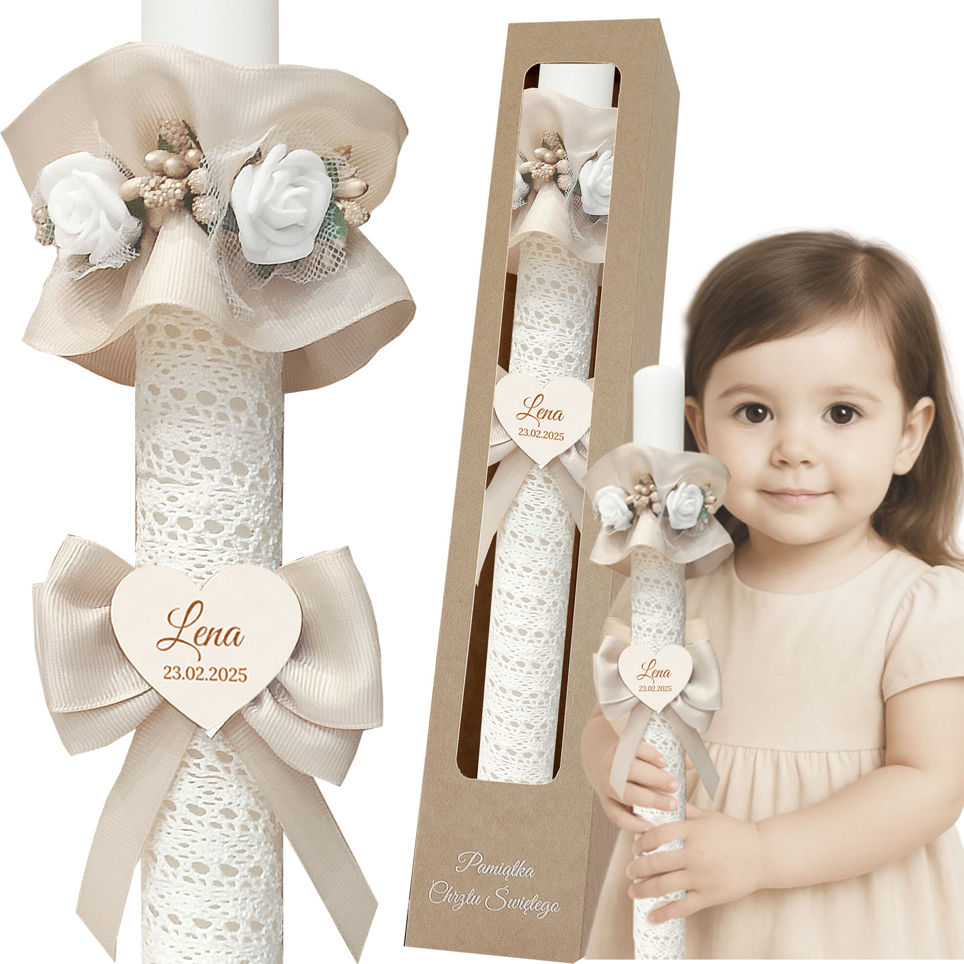 Елегантна хрестильна свічка в унікальному стилі бохо. Прикрашений вручну ніжним бежевим мереживом, що надає йому тонкого та природного шарму. Свічка має привабливий бантик із вигравіруваним іменем дитини та, за бажанням, датою хрещення, що робить її гарним сувеніром у цей особливий день.