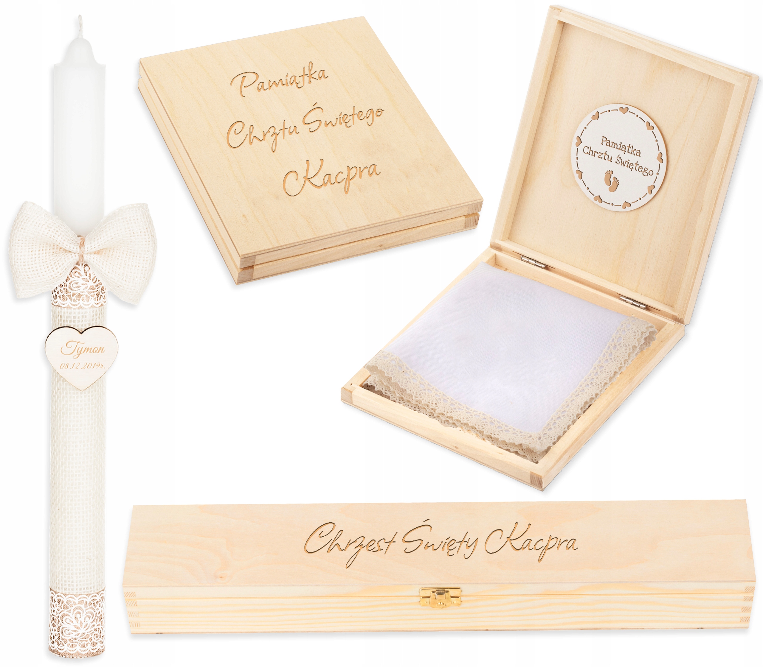 - лазерне гравіювання – до свічки кріпиться кулон, на якому ми гравіруємо ім'я дитини та дата святкування . Для гравірування ми використовуємо новітнє обладнання від світового лідера. Дерев'яна свічничка та тканина також нанесені лазерною технікою.