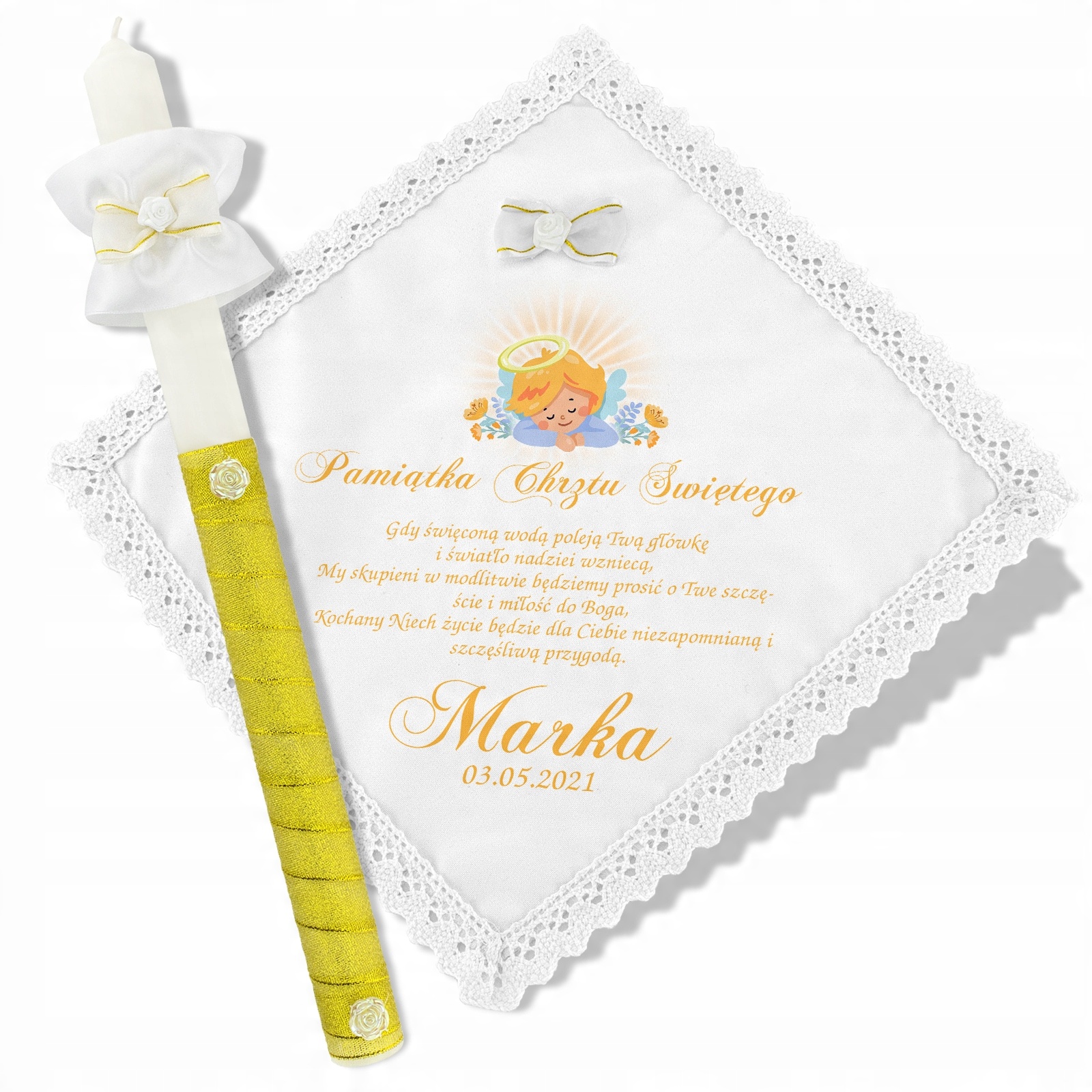 Елегантний комплект свічки та хрестильної тканини. Представляємо чудовий набір для дитини, яку буде хрестити. Декоративні елементи роблять хрестильну ризу і свічку чарівним сувеніром Святого Хрещення. Справжнім сюрпризом стане білий хрестильний халат з ім'ям дитини. До халата йде свічка. Це, безсумнівно, додасть усьому унікального характеру. Присвятіть набір для хрещення, назвавши своє ім'я та дату церемонії. Виразний принт збереже свій вигляд протягом багатьох поколінь. Свічка - це майстерність ручної роботи, яка порадує кожного.