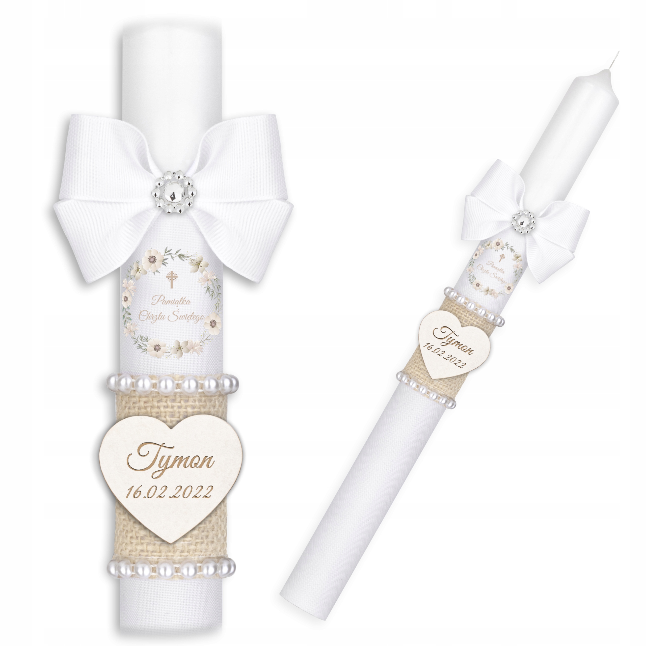 - ручна робота - свічка обгорнута атласним матеріалом з принтом "Сувенір на Хрещення". Декоративний бантик кріпиться до свічки. У центрі розташована джутова стрічка, відокремлена від решти свічки двома перлинними стрічками. На пов'язку ми розмістили сердечко з ім'ям дитини та датою хрещення.