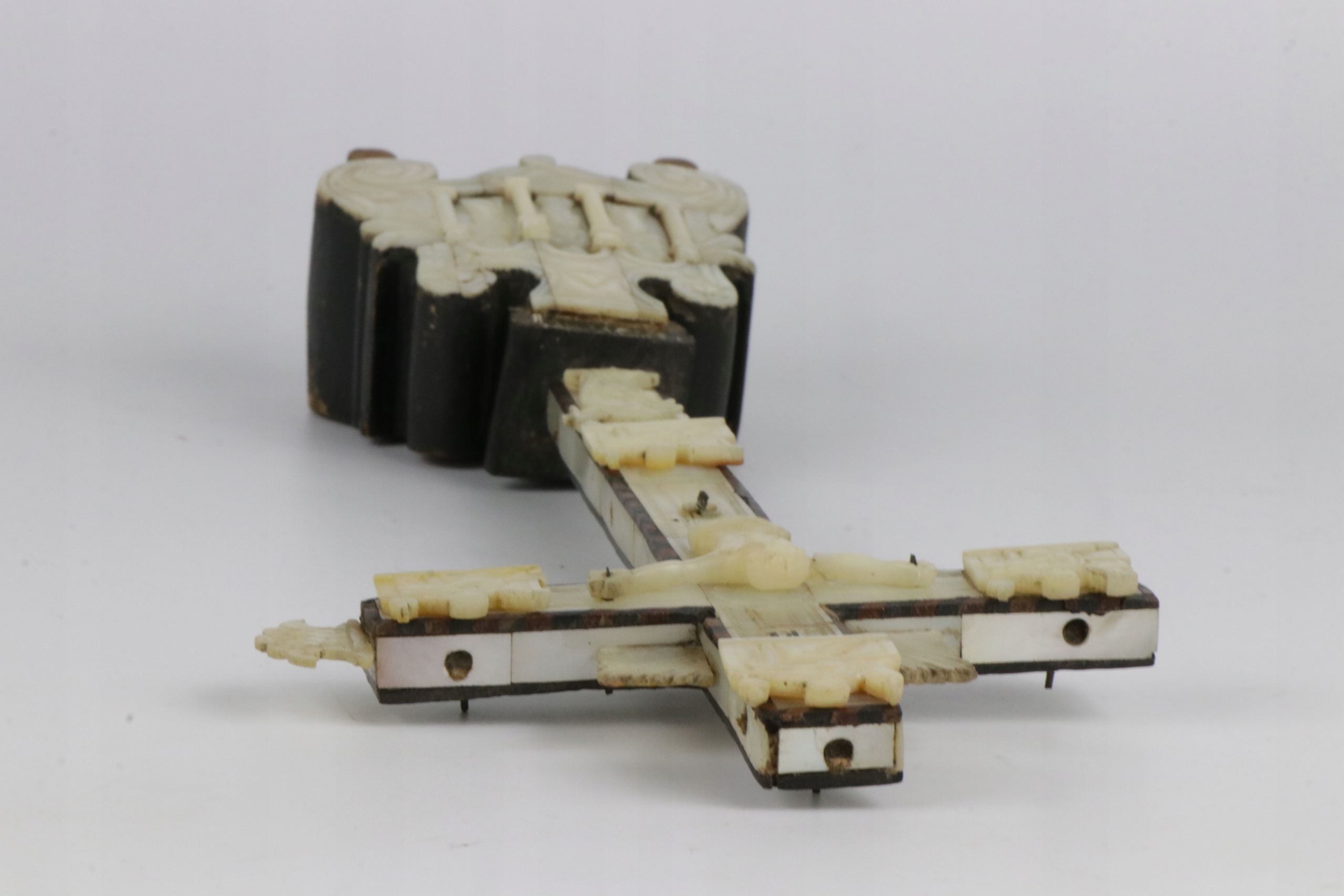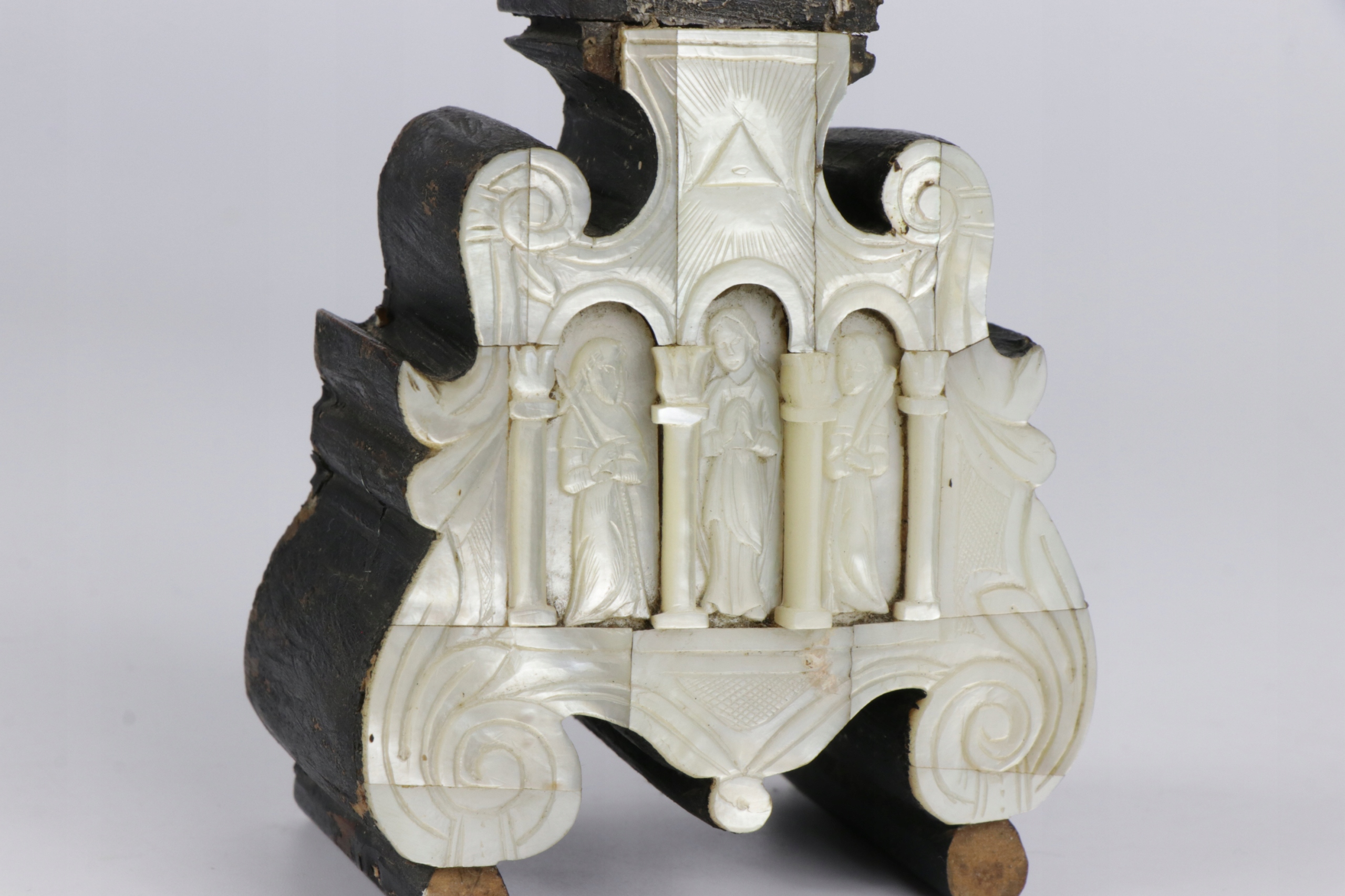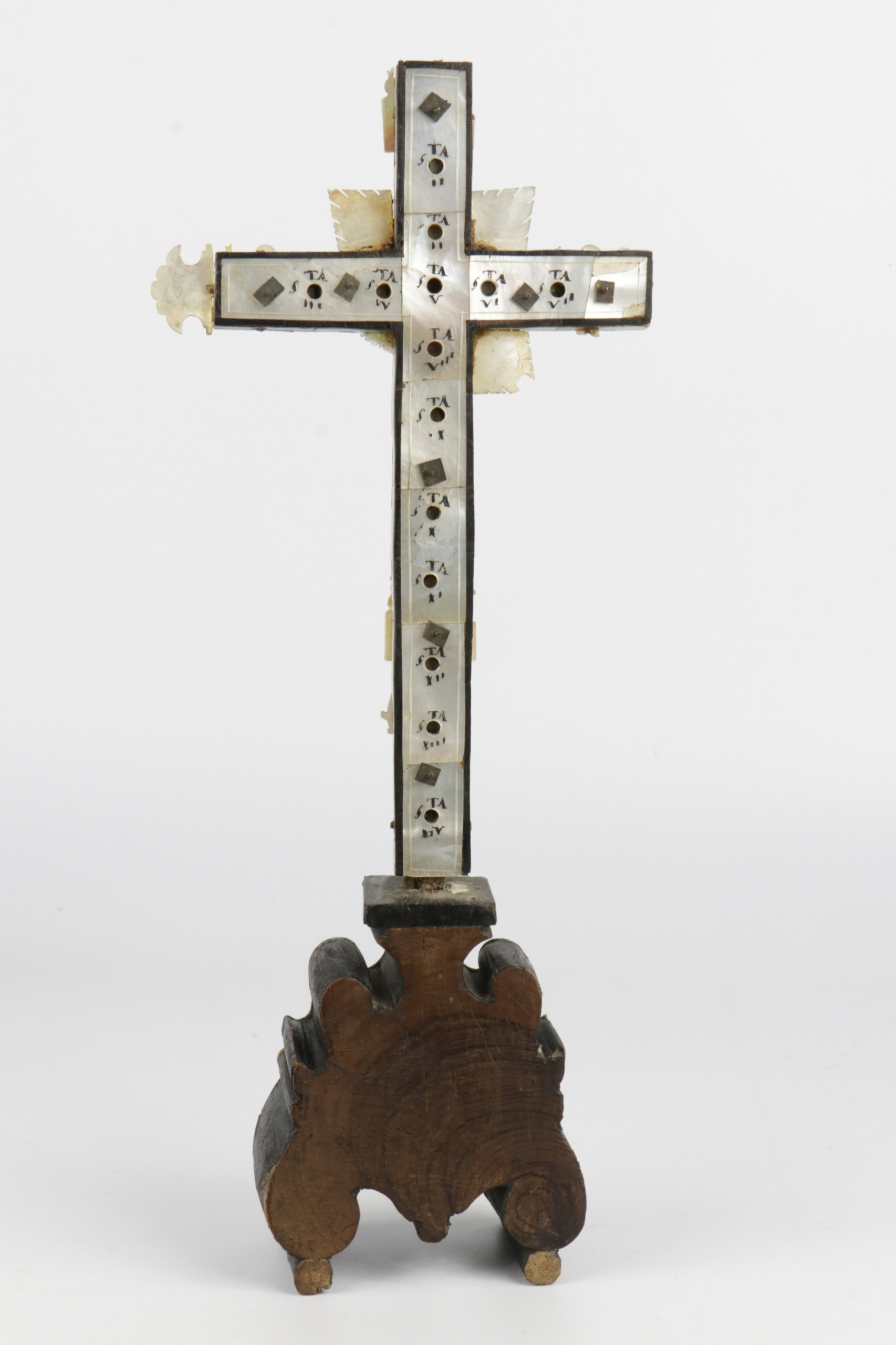 Старе розп'яття з перламутру, перламутру та оливкового дерева. Основа в стилі бароко, у нижній частині, під ногами Ісуса, знаходиться фігура Марії. На звороті є 14 отворів, які символізують 14 станцій Хресної дороги. В основі, у стилізованій потрійній ніші, розміщено фігуру Марії та, найімовірніше, Петра і Павла. Дуже гарно виконано філігранний орнамент. В Інтернеті є дуже схожі розп’яття, походження яких описується як Свята Земля, Єрусалим, 18, 19 століття.