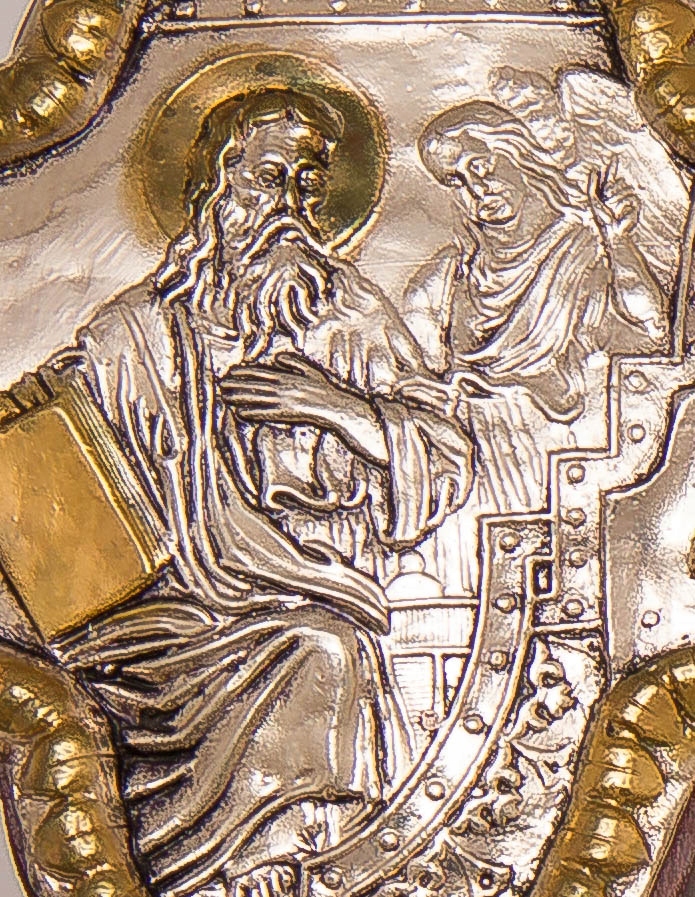 Це розп'яття можна виставити як висячий хрест. Це класичне місіонерське розп'яття. На раменах розп'яття розміщені фігури євангелістів. Вся вона покрита чітким декоративним рельєфом. Металева смуга. Посріблена та вибірково позолочена поверхня для кращого естетичного ефекту.