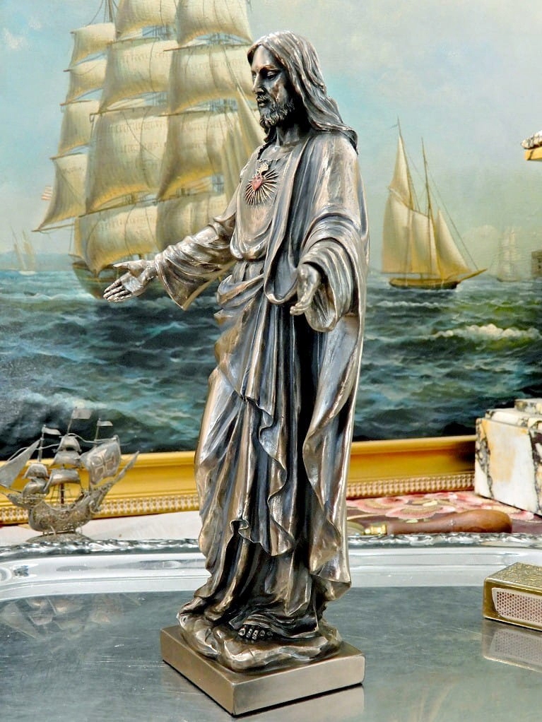 Запрошую придбати чудову фігурку Ісуса з «відкритим серцем», символ любові. Все виглядає фантастично, а фотографії не передають цього. Бренд Veronese гарантує якість і зовнішній вигляд. Вся ця річ зроблена з конгломерату смоли та алебастру, металізована та розписана вручну. Загальний колір стара латунь.