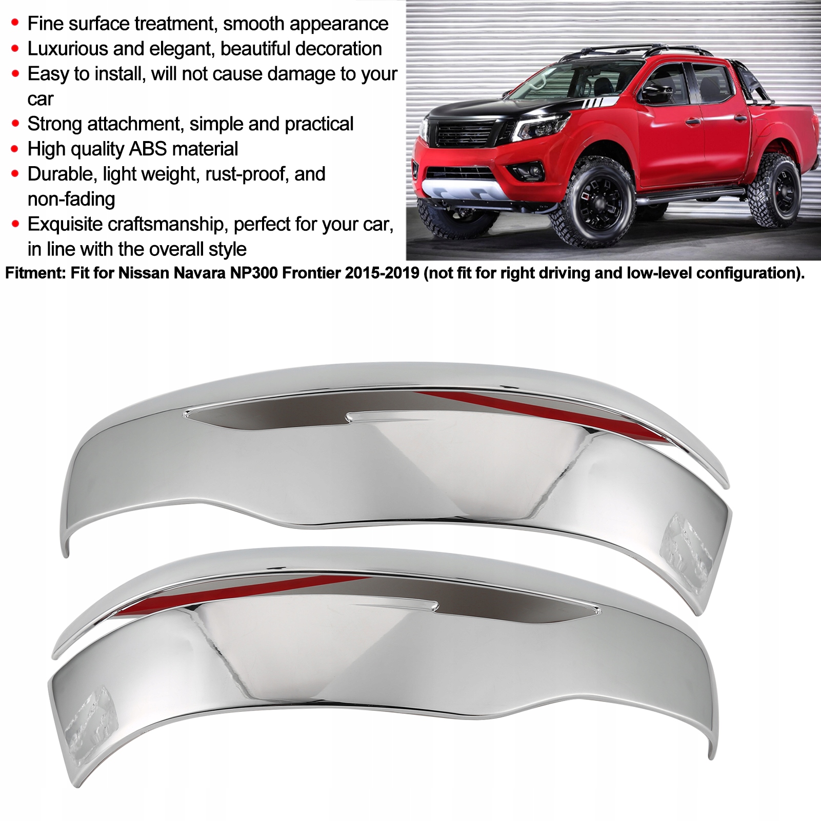 1. Оброблена тонка обробка поверхні, це прекрасна прикраса з гладким, розкішним і елегантним зовнішнім виглядом. 2, легко встановити, можна міцно прикріпити, не пошкодивши автомобіль, простий і практичний. 3. Використовується високоякісний матеріал ABS, він міцний, легкий, стійкий до іржі та не змінює колір. 4. Завдяки вишуканій майстерності він ідеально підходить для вашого автомобіля, відповідно до загального стилю. 5, підходить для Nissan Navara NP300 Frontier 2015-2019 (не підходить для правильного водіння та конфігурації низького рівня).