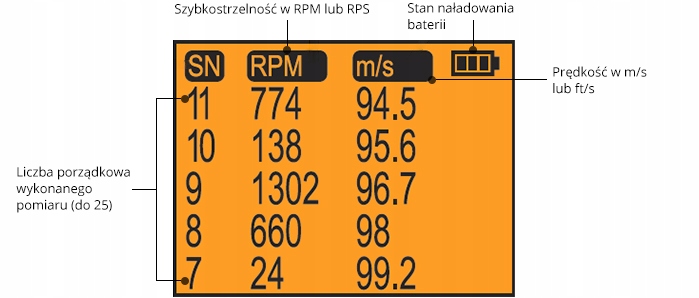 - Вимірювання швидкості виходу в діапазоні [ft/s]: від 90 до 1200