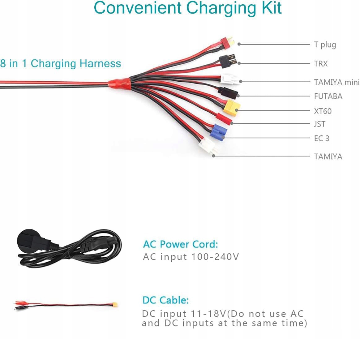 зарядний комплект з 8 популярними з'єднувачами (Deans, Xt60, Tamiya, Tamiya Mini, Trx, Futaba, JST, EC3). Якщо ви не використовуєте роз'єми TRX та деканів, не видаляйте ізоляційні захисні щити.