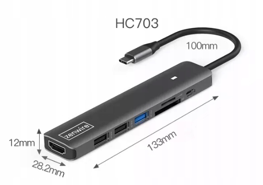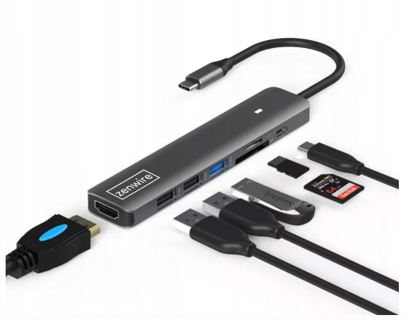 АДАПТЕР USB-C HUB 7in1 ZENWIRE з портами: HDMI 4K, USB 3.0, 2x USB 2.0, SD і micro SD, Power Delivery 100W