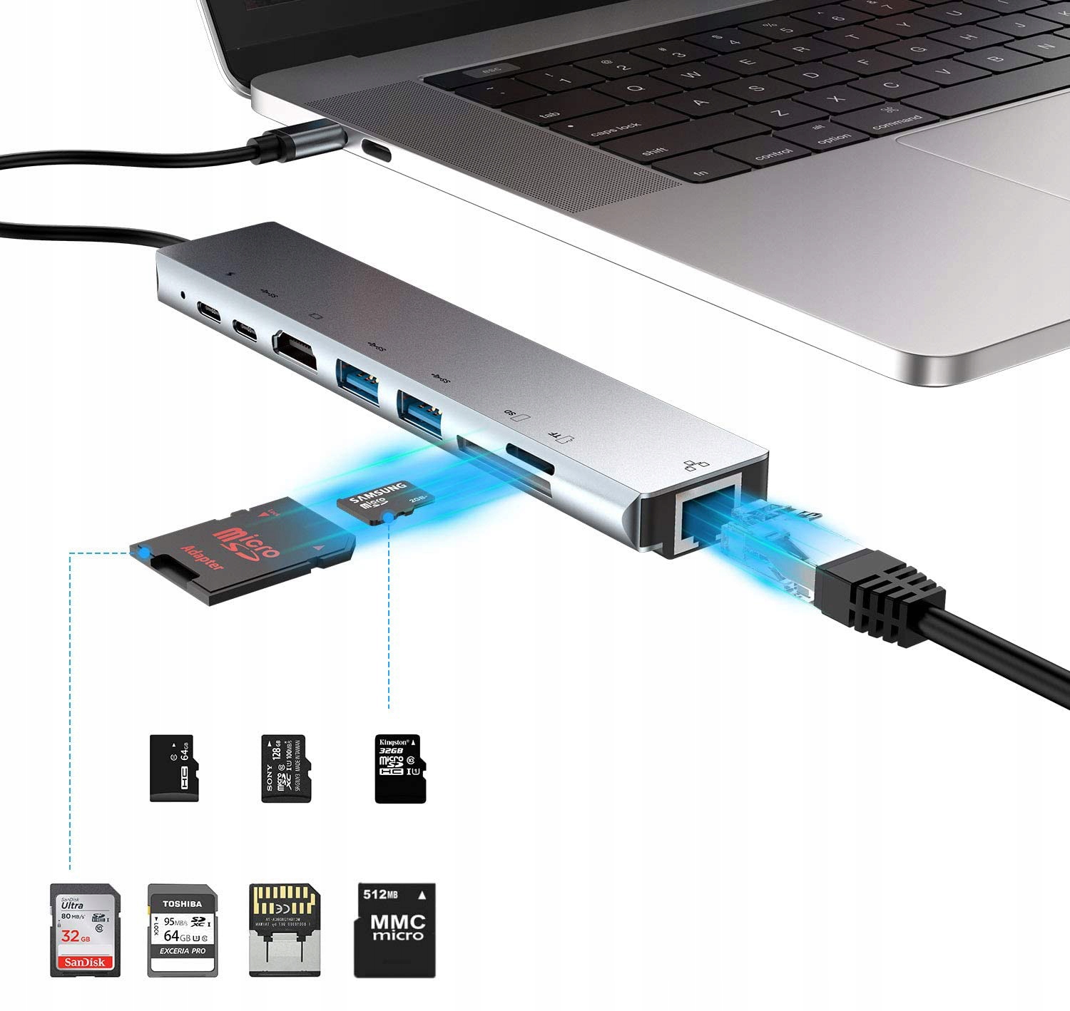 АДАПТЕР USB-C LAN RJ45 HDMI 4k Micro SD 2x USB 3.0 Power Delivery PD