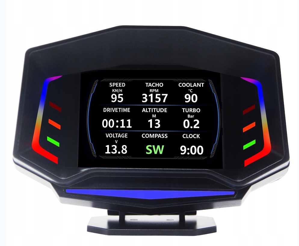 чітке відображення багатьох даних: швидкість транспортного засобу, напруга, температура води, швидкість обертання, споживання палива, час руху, відстань, загальний пробіг, температура повітря впускного повітря, температура масла, тиск масла, турбокомпресор, список PID, швидкість, що перевищує сигнал тривоги, швидкість тривоги, низька напруга, тривога води, компаса, не витрачають на себе, виноски, і не визначають, що ви зможете.