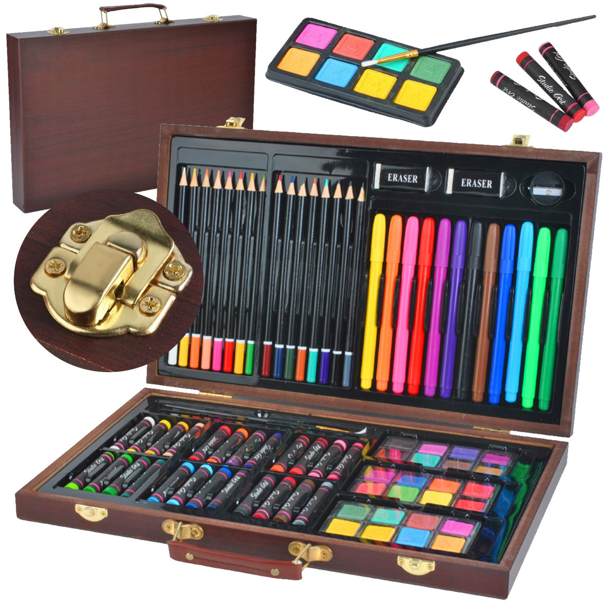 81 елементи - За допомогою такого вибору ваша дитина легко створить найскладніший, творчий та оригінальний художній твір! Крім того, все є в одному, великій дерев’яній валізі , закріпленій засувкою з практичною ручкою, завдяки якому набір можна легко взяти з собою, де ви хочете!