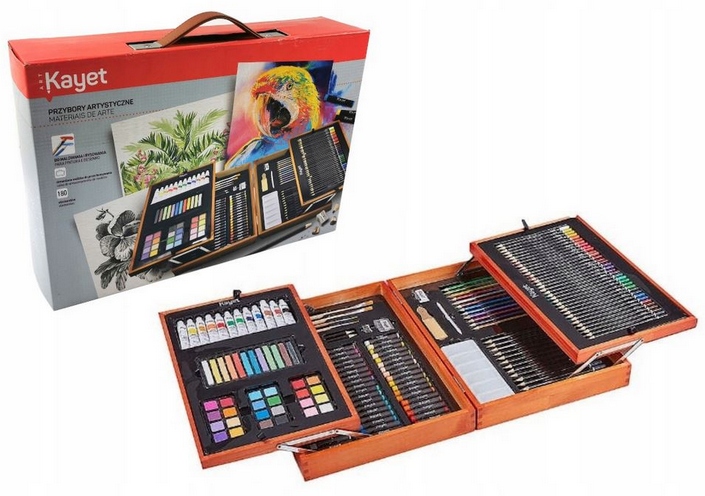 Арт-набір KAYET має стильну дерев'яну валізу з ручкою для зберігання аксесуарів. Весь набір дуже великий, адже містить цілих 180 різноманітних елементів, як для малювання, так і для малювання. Набір включає, серед іншого: Все було зроблено ретельно та з увагою до кожної деталі. Це чудовий набір для початку вашої мистецької пригоди.