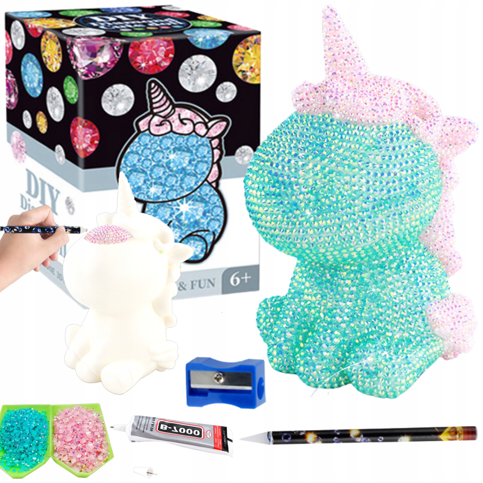 Щоб створити привабливу фігурку, набір містить різнокольорові діамантирізного кольору. Різнокольорові кристали додають блиск і роблять єдинорога унікальним і неповторним. Піднос зі стразами дозволяє зручно зберігати та впорядковувати кристали, забезпечуючи легкий доступ до них під час створення.
