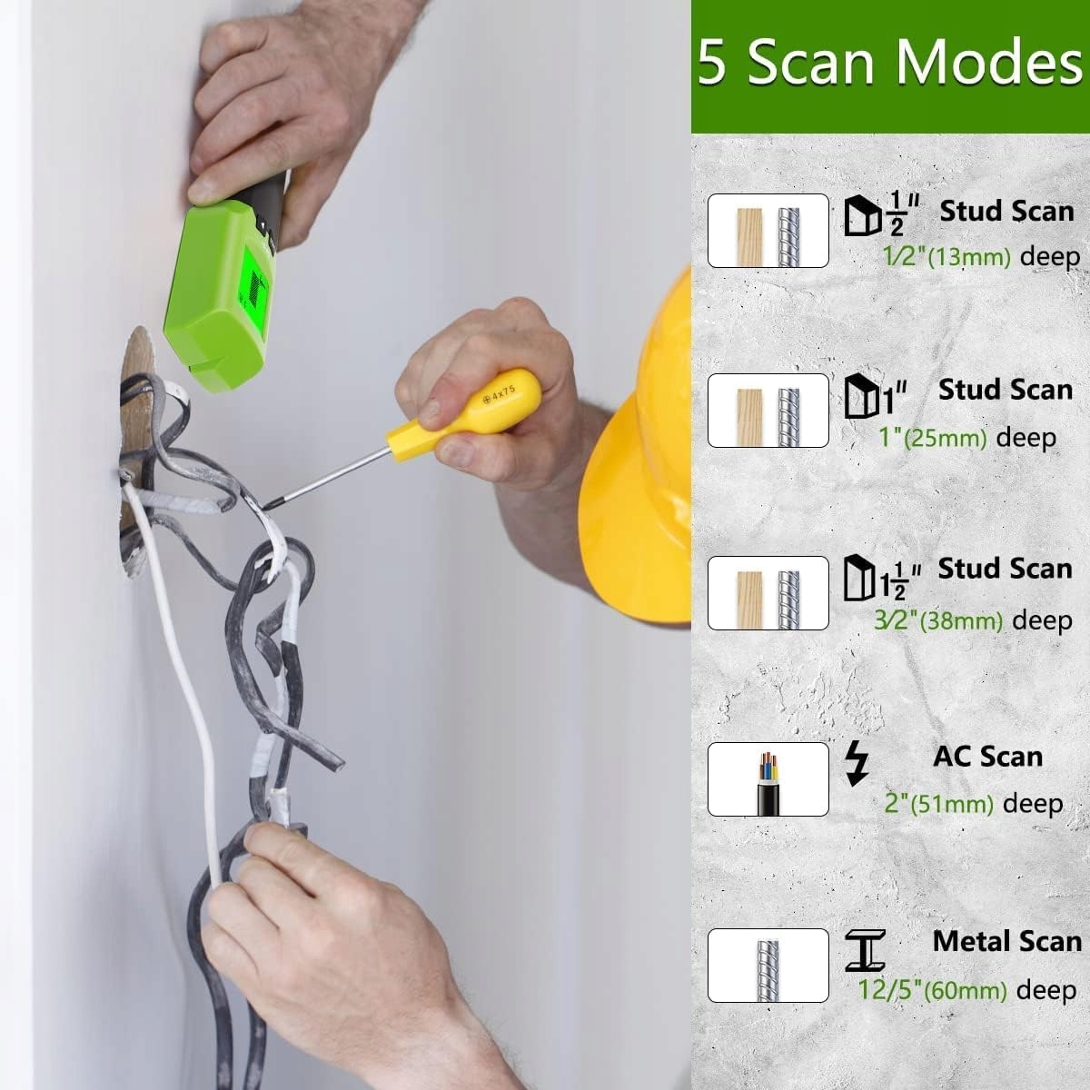 - П'ЯТЬ РЕЖИМІВ СКАНУВАННЯ: цифровий настінний сканер пропонує 5 режимів сканування - три режими сканування шпильок на різній глибині, режим сканування металу та режим проводу змінного струму. Режими сканування штифтів включають глибину 1⁄2 дюйма (12 мм), глибину 1 дюйм (25 мм) і глибину 11⁄2 дюйма (38 мм). Режим сканування металу може сканувати метал на глибину 2,36 дюйма (60 мм), режим кабелю змінного струму може виявляти кабелі змінного струму під напругою на глибину до 51 мм.