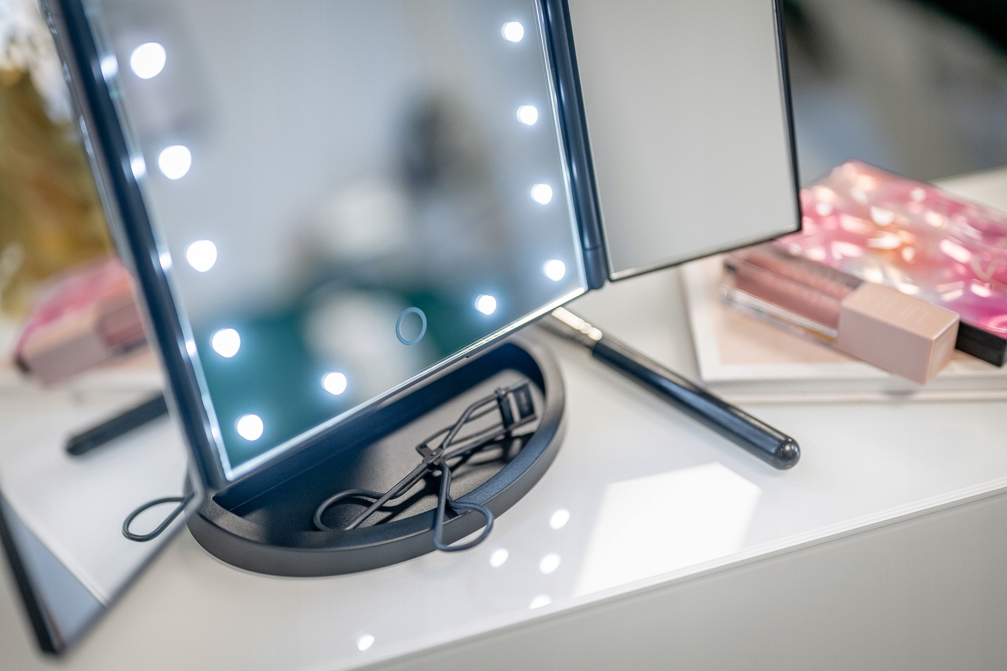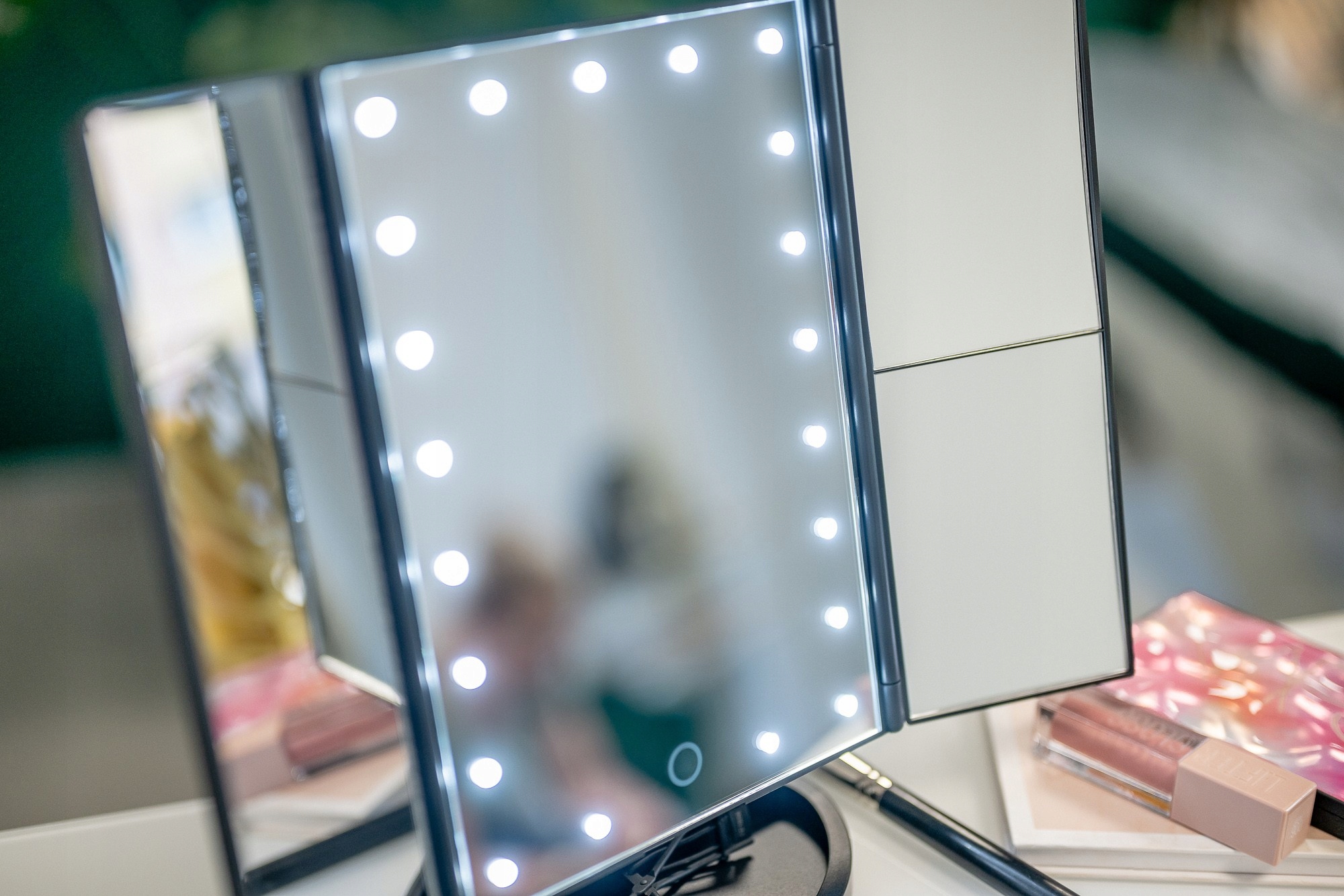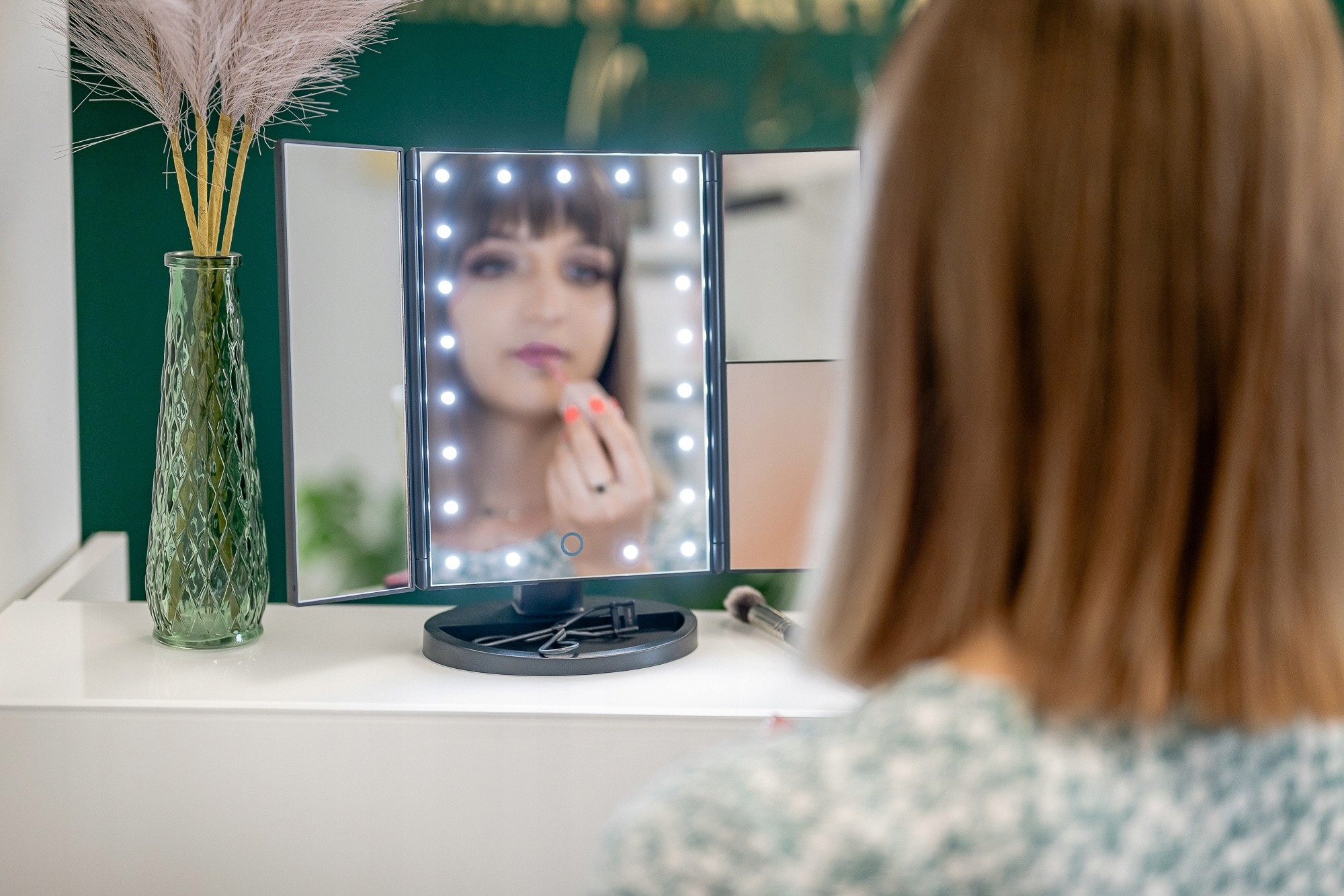 🎨 Революційна система трьох дзеркал, стратегічно навколо основного дзеркала, є перевіреним рішенням з професійних салонів краси. Забезпечує рівне і м'яке освітлення обличчя , усуваючи тіні та спотворення. Це гарантія, що ваш макіяж буде ідеальним у кожному світлі!