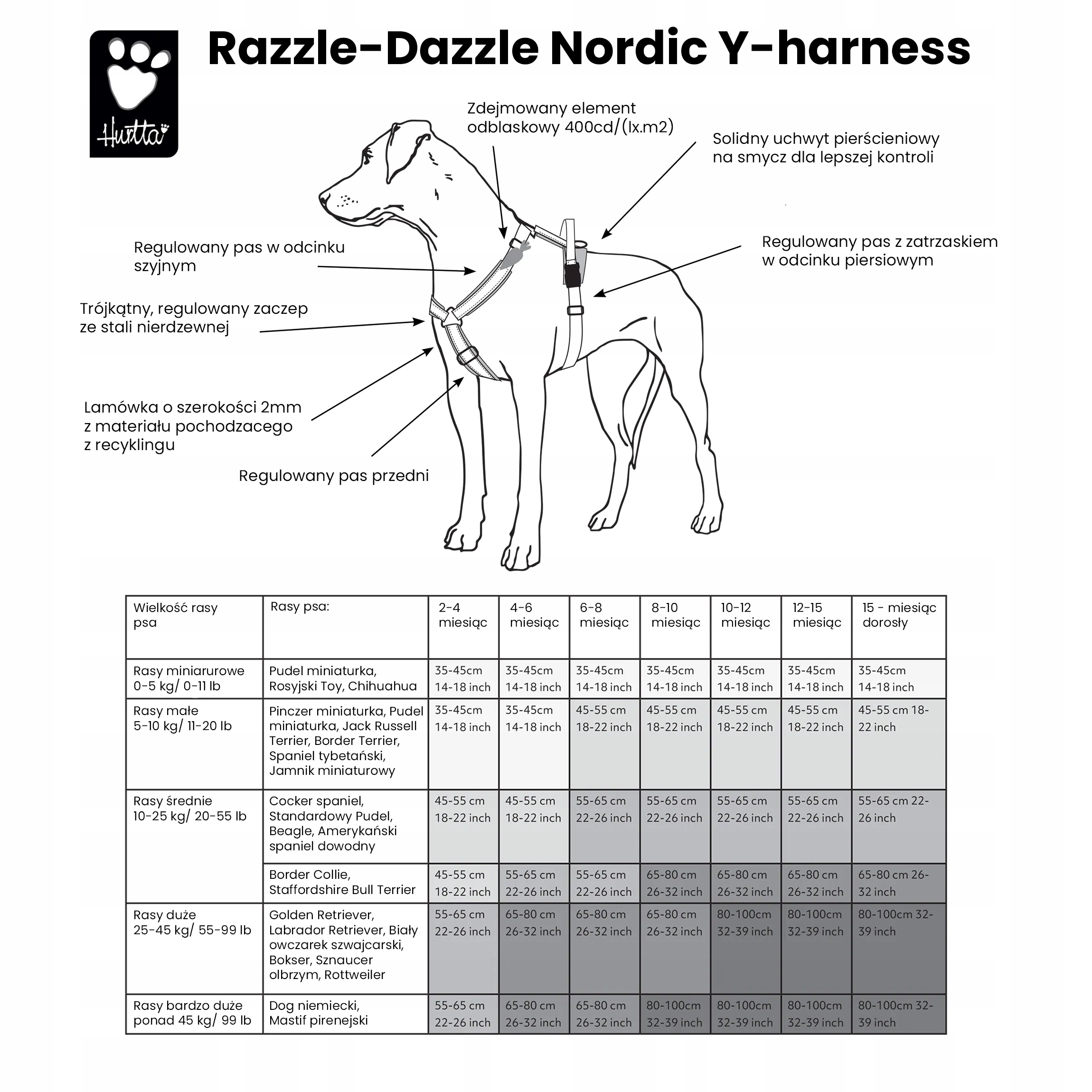 Hurtta Razzle-Dazzle H-Harness дуже зручно використовувати та надзвичайно легко надягати та знімати. Ручка на спині полегшує керування собакою в складних умовах і екстрених ситуаціях. Знімний світловідбиваючий елемент кумедної форми забезпечує хорошу видимість під час пересування в темний час доби і в несприятливу погоду. Ремені дуже міцні та перевірені на безвідмовне та тривале використання. Їхня м’яка підкладка та ремінці, які запобігають натиранню та підвищують комфорт під час носіння, виготовлені зі 100% перероблених матеріаліві мають сертифікати безпеки СТАНДАРТ 100 СТАНДАРТУ OEKO-TEX® та Регламент REACH 1907/2006 SGS Lab Standards . Металева фурнітура перевірена на корозію відповідно до EN ISO 9227: 2017 (E).