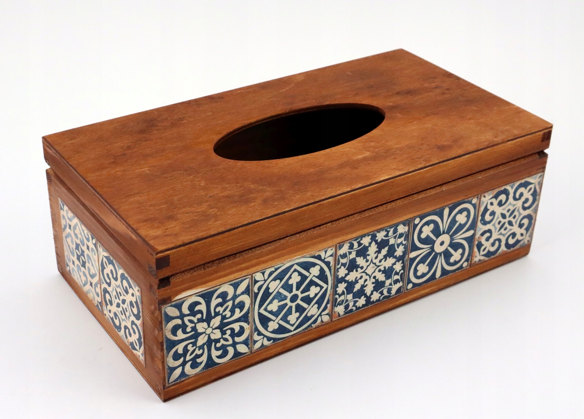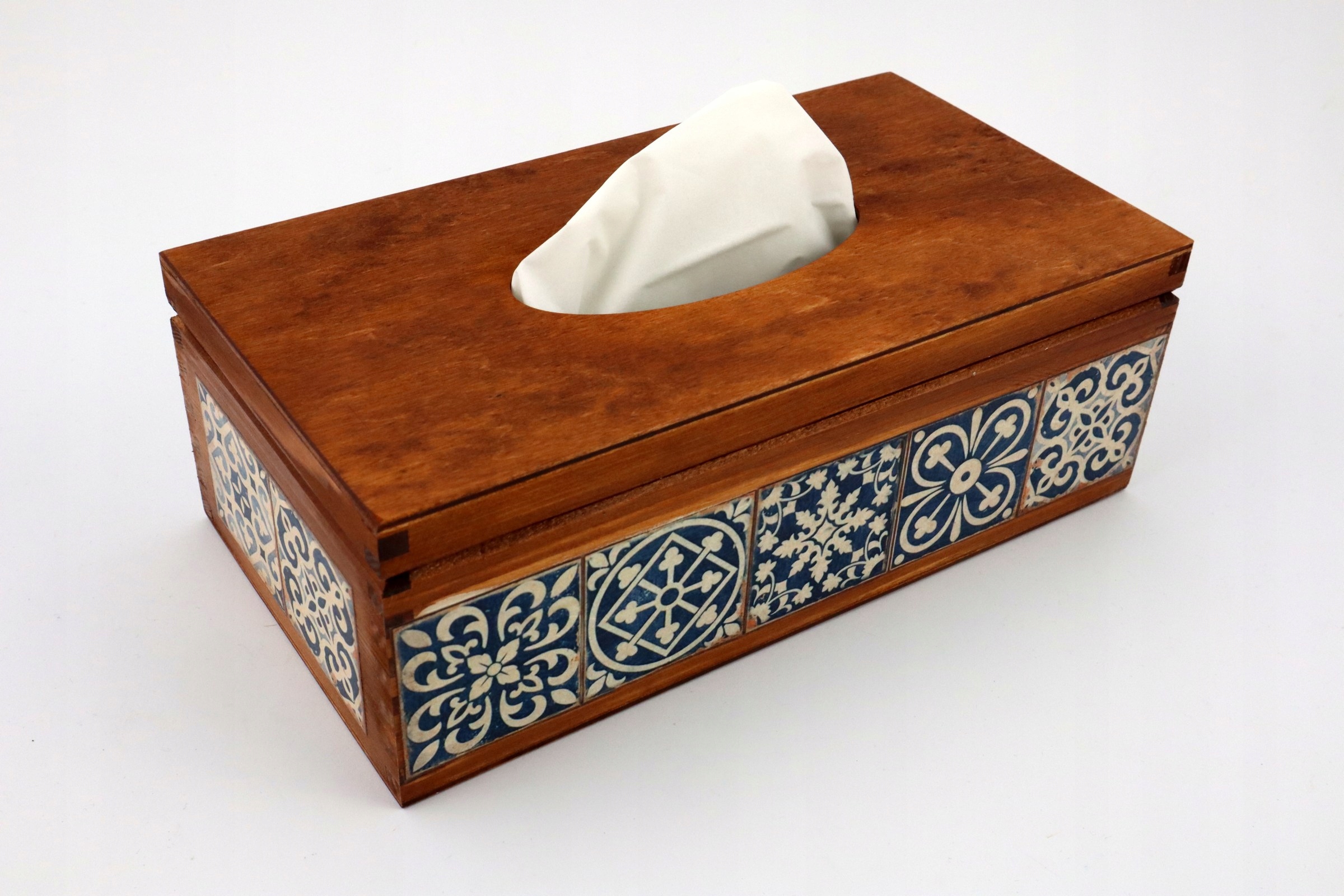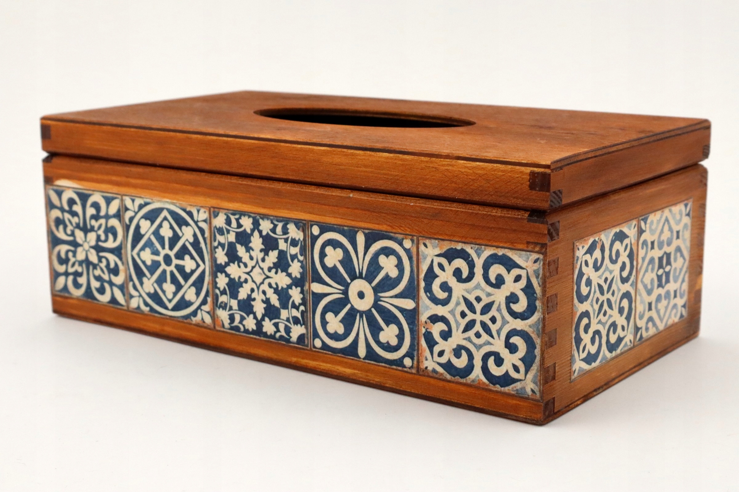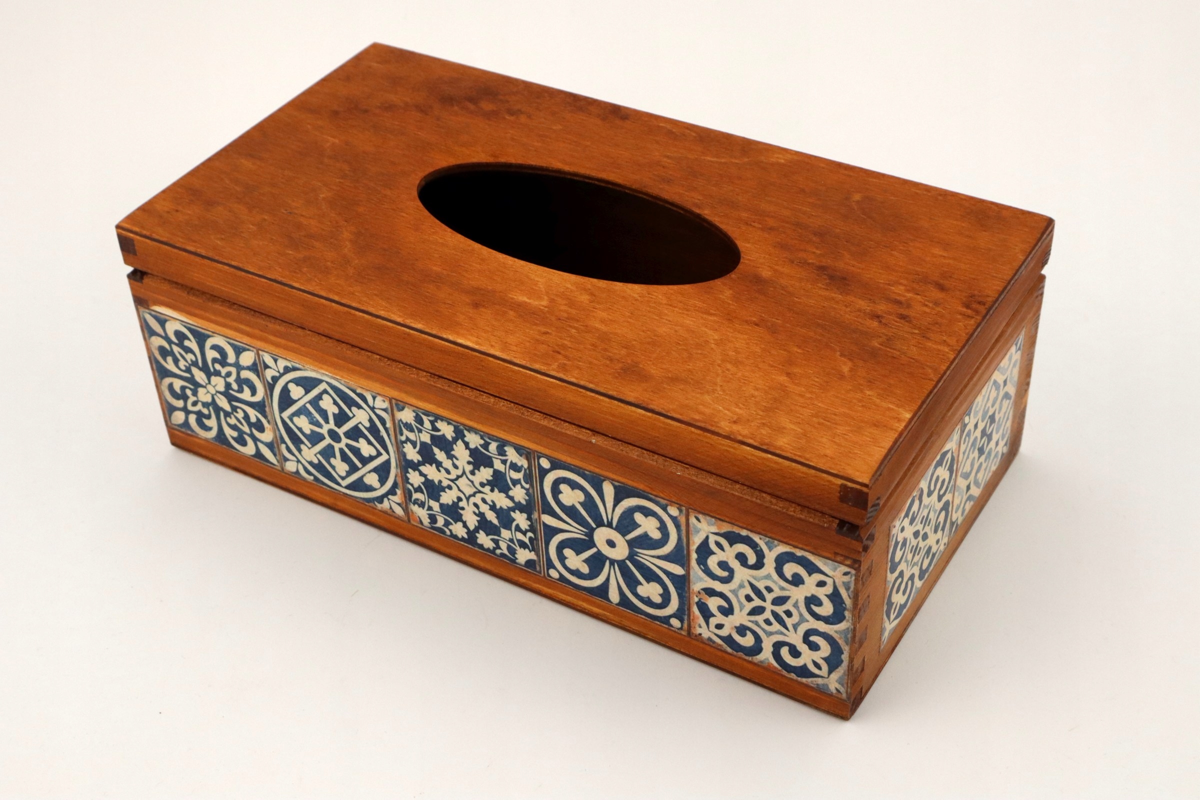 Прямокутна хустка, дерев'яна, ручний розпис, відкривається зверху. Прикрашено методом декупаж рисовим папером з мотивом азулежуш.
