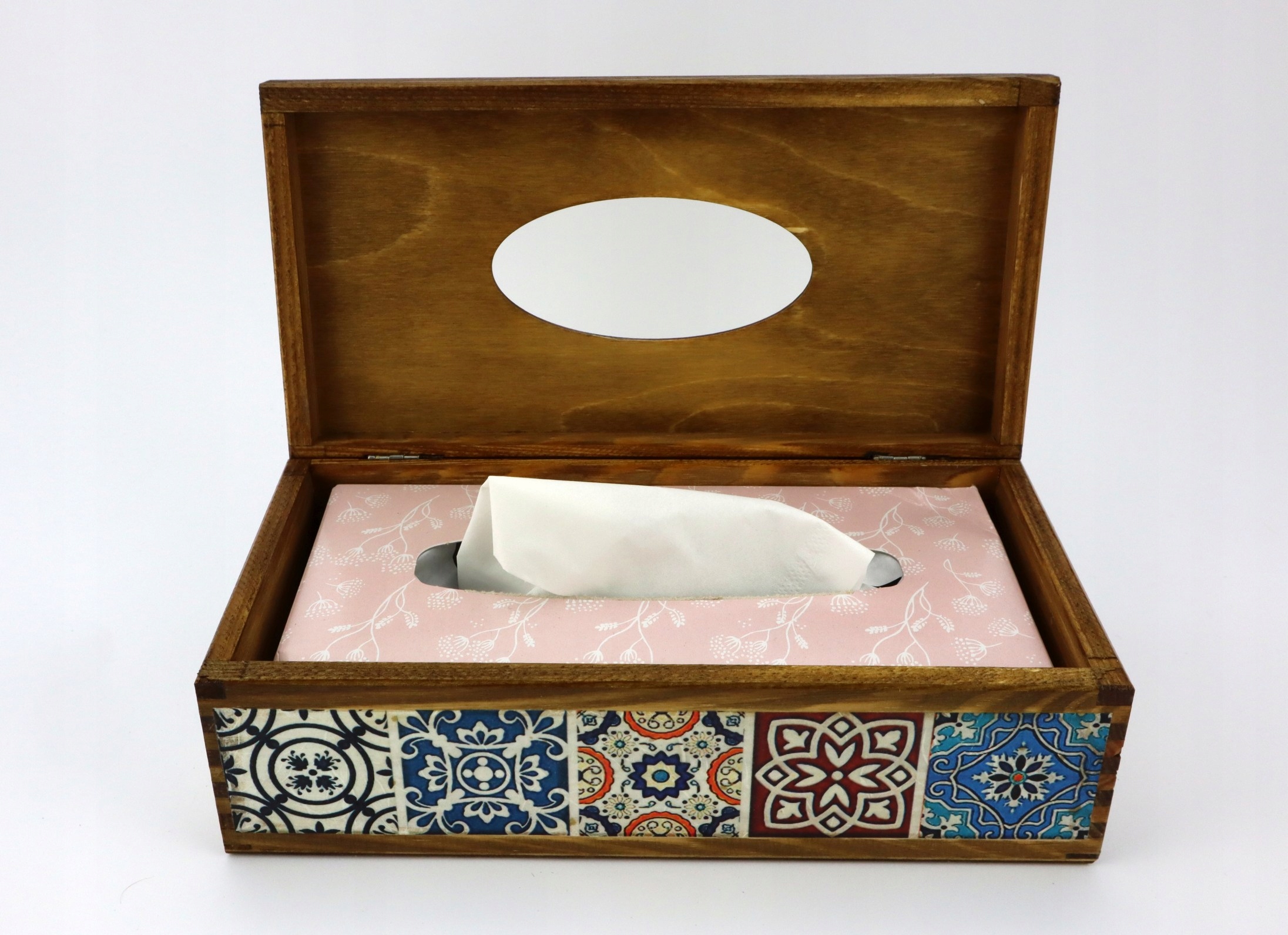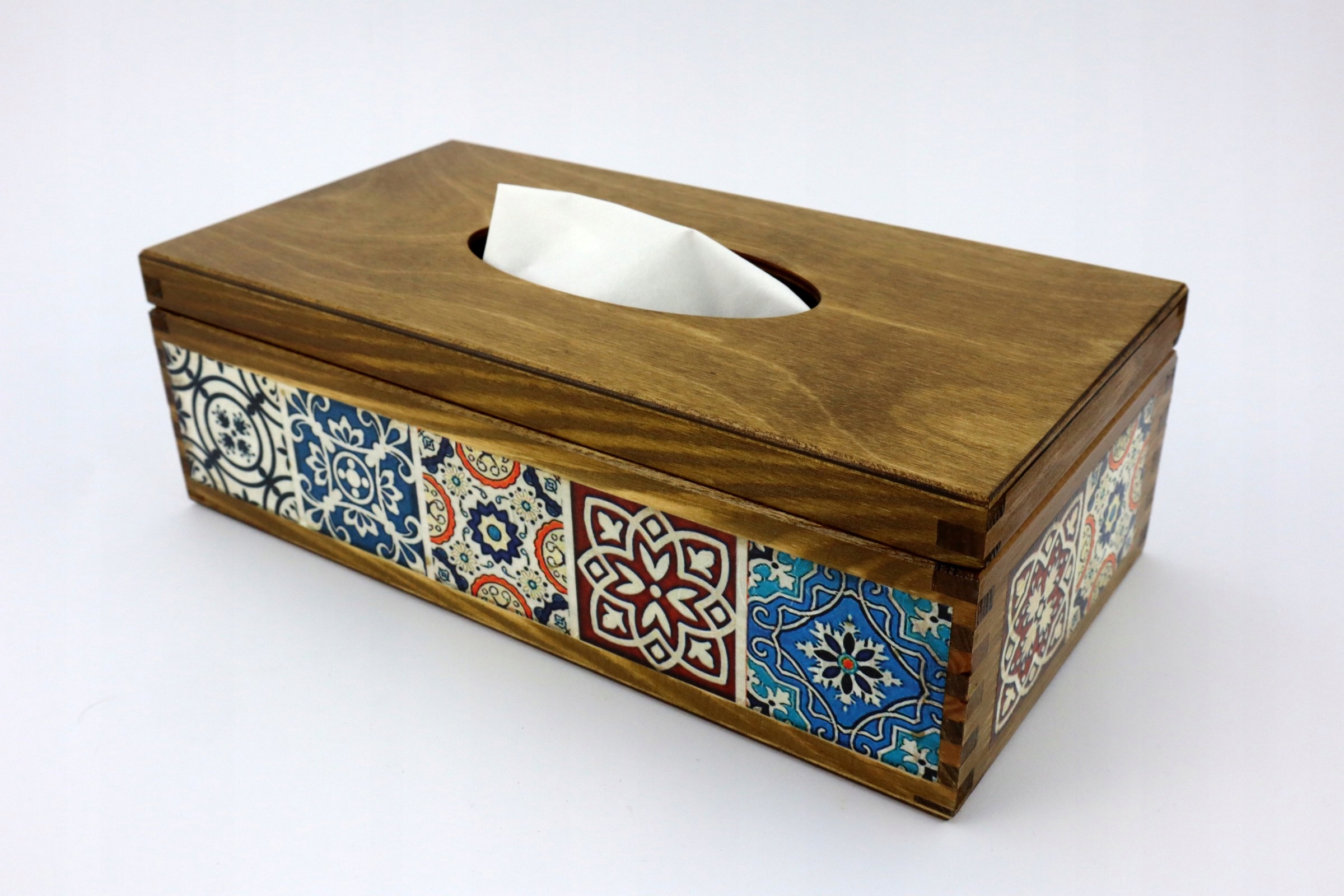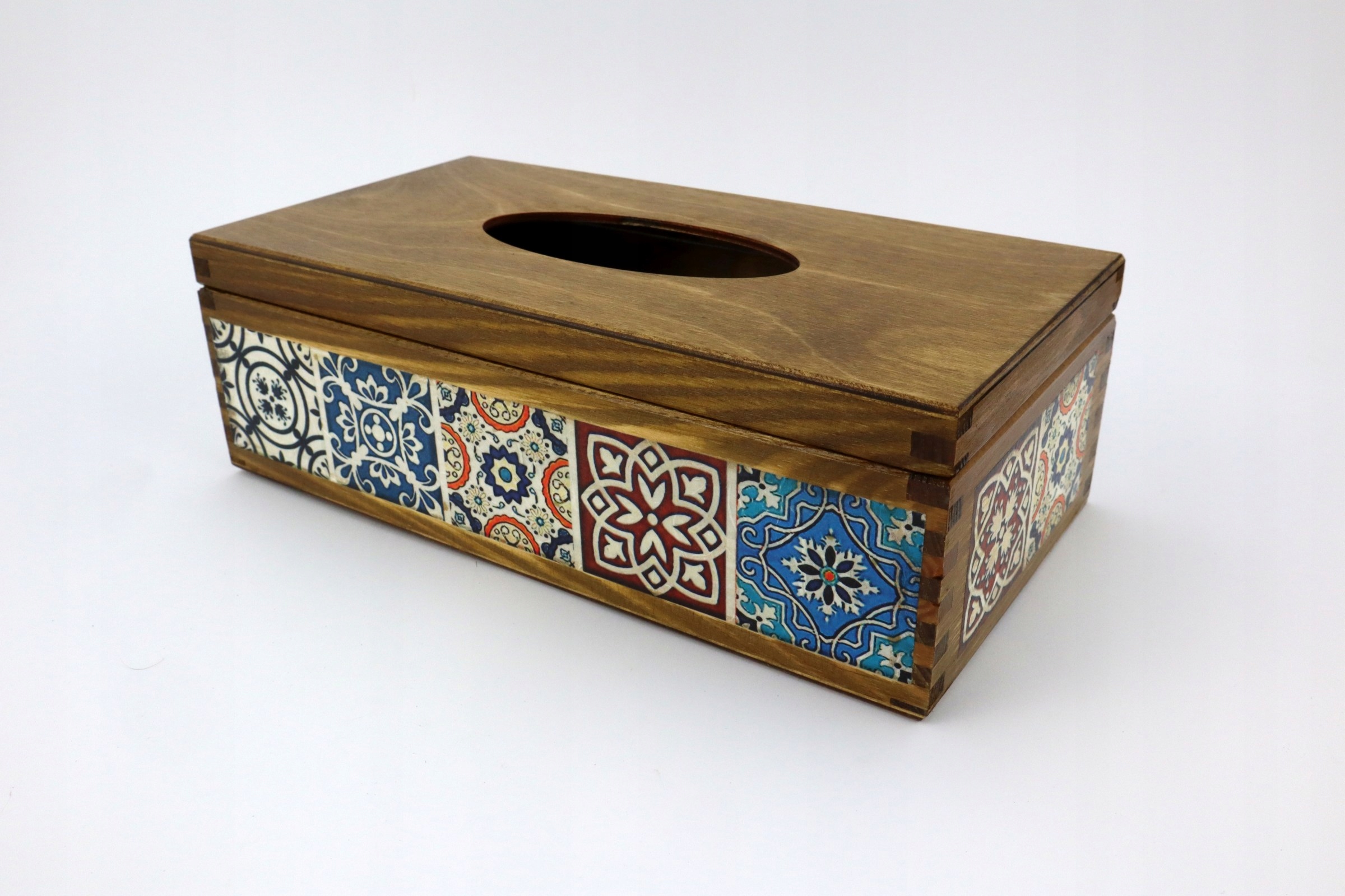 Прямокутна хустка, дерев'яна, ручний розпис, відкривається зверху. Прикрашено методом декупаж рисовим папером з мотивом азулежуш.