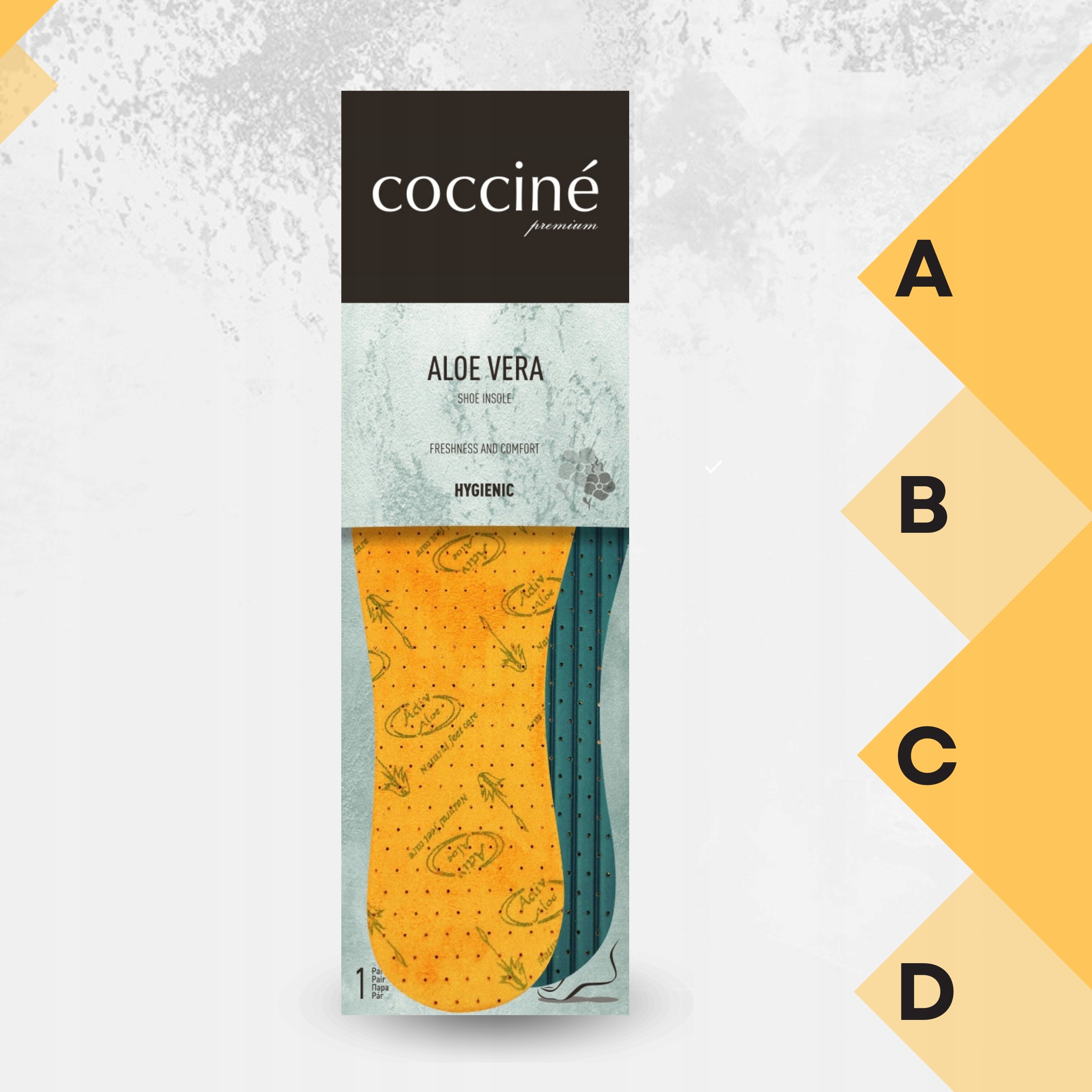 Coccine Aloe Vera — універсальні устілки з антибактеріальними, антипітливими та освіжаючими властивостями. Натуральний екстракт алое живить шкіру ніг, а гнучкий дизайн підвищує комфорт навіть під час довгого дня. Ідеально підходить для весни та літа!
