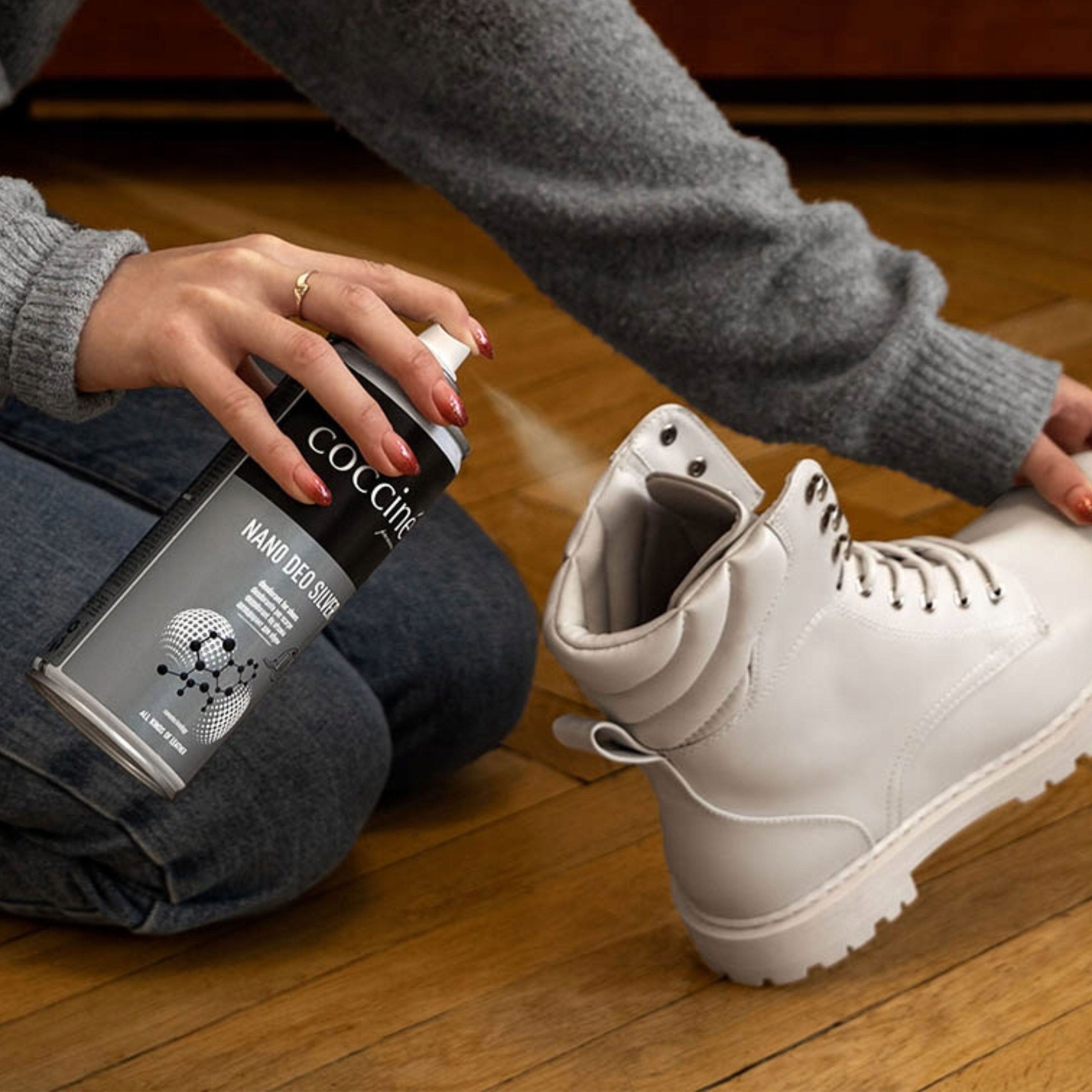 Coccine Nano Deo Silver 400 мл – це сучасний дезодорант для взуття, який завдяки нанотехнологіям не лише зберігає свіжість взуття, але й гігієну ніг. Срібло проникає в структуру матеріалу, бореться з бактеріями та нейтралізує запахи, а кремнезем поглинає зайву вологу.
