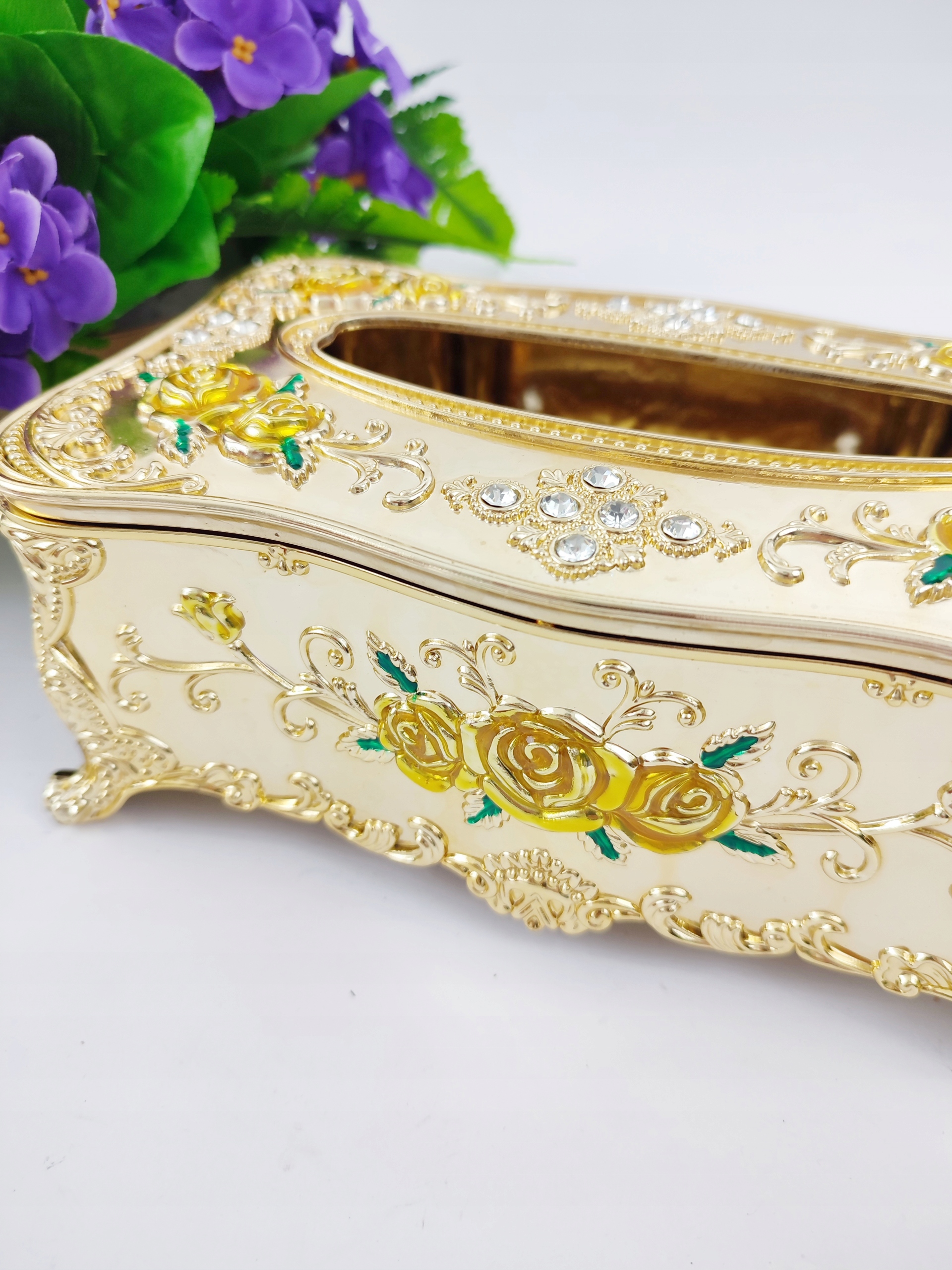 Елегантний контейнер для декоративних серветок. Оптимальні розміри дозволять зберігати велику кількість серветок, тому вам не доведеться турбуватися про часте наповнення контейнера. Коробка має зручний магнітний отвір і вирізаний отвір, через який можна легко вийняти серветки, не ризикуючи порвати. Додатковим декоративним елементом є мотив троянди та декоративні стрази. Ідеально підходить для будь-якої кухні.