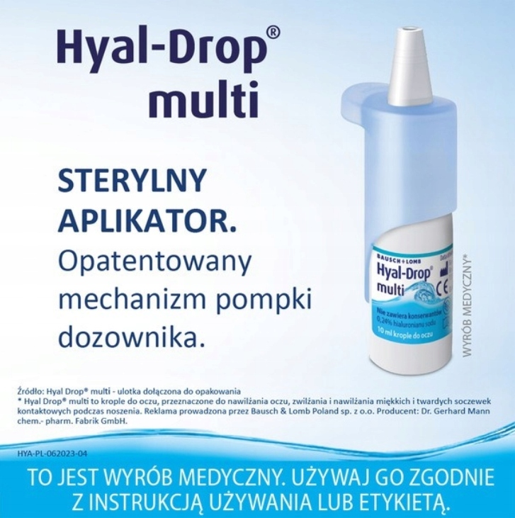 Hyal-Drop multi, очні краплі 10 мл - препарат, який забезпечує негайне полегшення та зволоження очей у разі сухості, спричиненої факторами зовнішнього середовища. Це природним чином освіжає та заспокоює сухі очі, забезпечуючи полегшення від симптомів втоми, подразнення та навіть надмірної сльозоточивості очей.