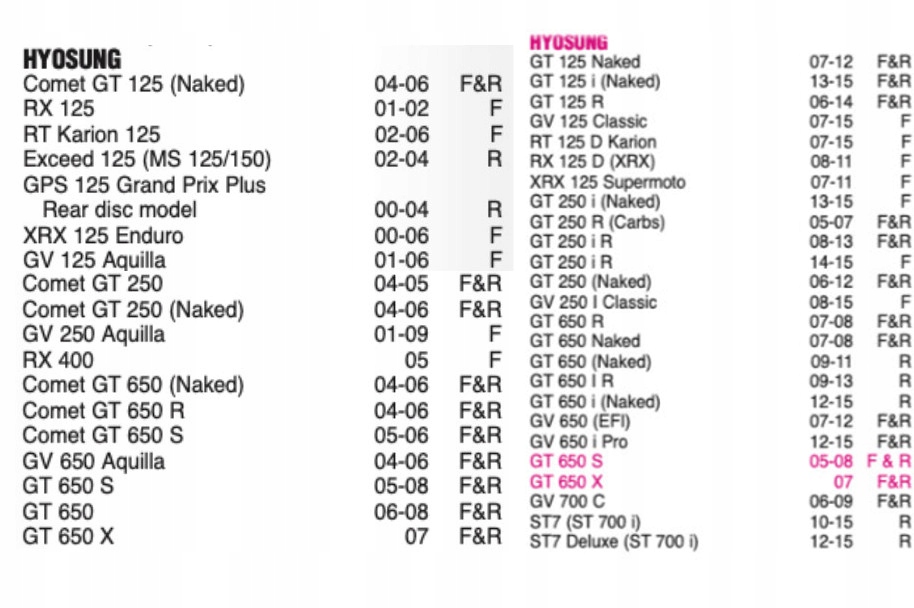 Hyosung Comet RT RX XRX GV GT 125 250 650 R Гальмівні колодки передні/задні