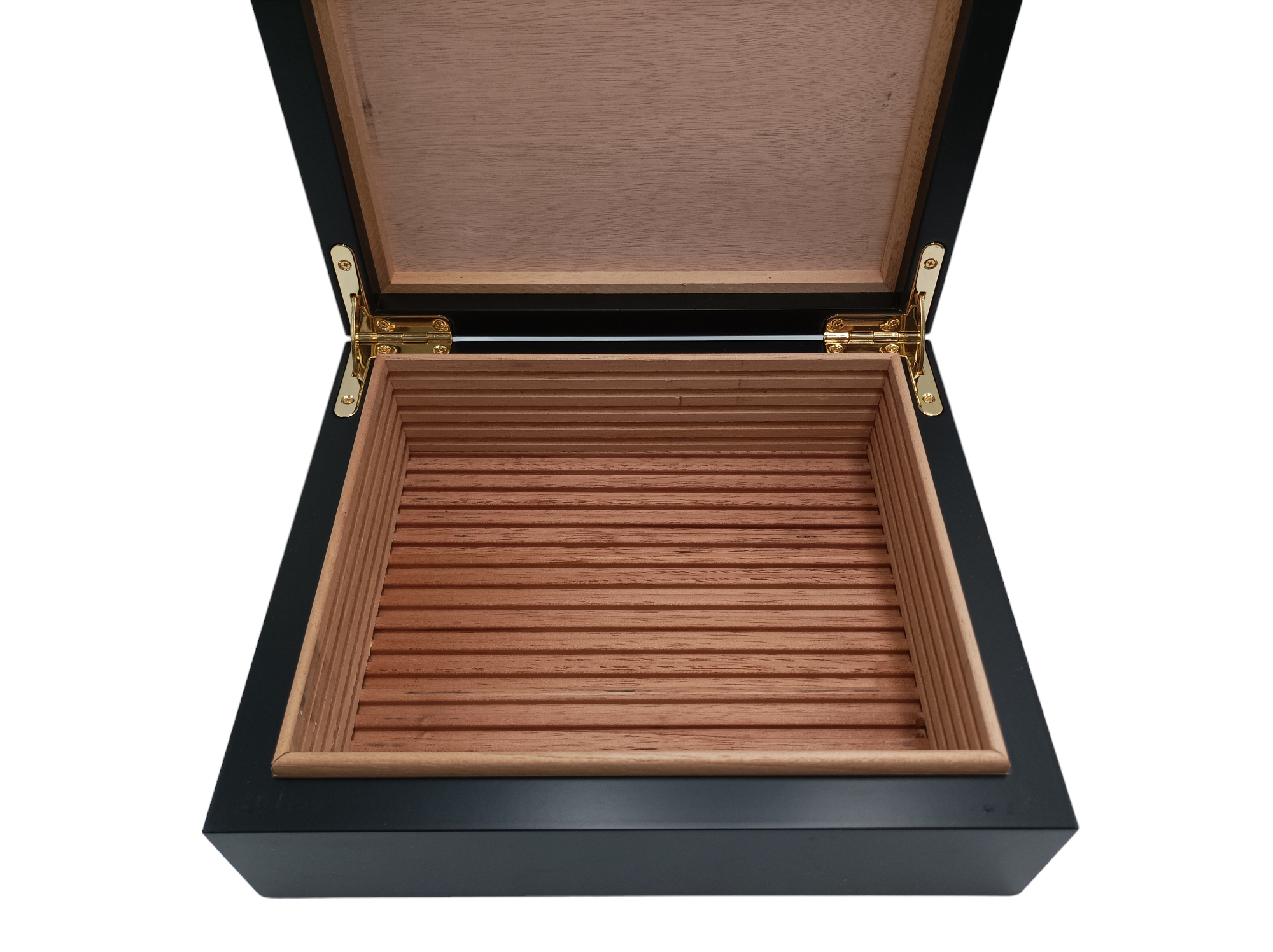 Елегантний дизайн із шаруватим чорним покриттям робить цей х’юмідор гарним доповненням до будь-якого інтер’єру. Позолочені петлі забезпечують виняткову стабільність, а внутрішня частина, облицьована іспанським кедром пропонує ідеальне середовище для зберігання до 30 ваших улюблених коронних сигар. Вентиляційні ребра RibTech, виготовлені з кедра, і точно відкалібрований гігрометр працюють разом із зволожувачем Adorini, щоб підтримувати відповідну вологість усередині хьюмідора. Зволожувач повітря з антибактеріальної полімерної тканини дозволяє точно контролювати вологість, а металева пластина під кедровим шпоном дозволяє встановити зволожувач і гігрометр. Інноваційна система відділень із затискачами для етикеток полегшує впорядкування сигар. Х'юмідор Torino Deluxe - це поєднання надійності, універсальності та відмінного співвідношення ціни та якості, що робить його одним із найпопулярніших х'юмідорів на ринку.