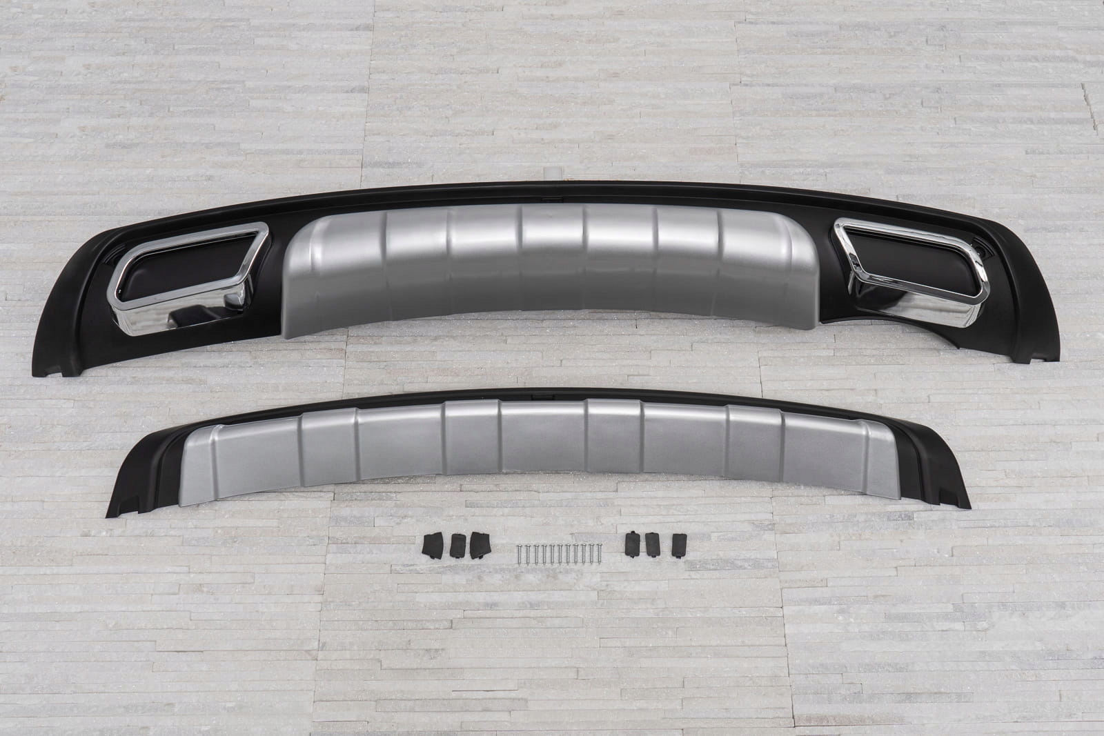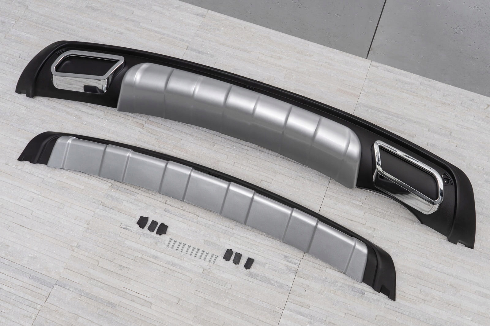 У комплект входять дві бічні панелі: для передньої та задньої частини автомобіля. Чохли виготовлені з високоякісного ABS-пластику, покритого чорним і сріблястим лаком з виглядом алюмінію. Додаткові імітації наконечників вихлопної системи були включені в задню спідницю, що надає їй сильного характеру. Імітація хромованих бордюрів додає елементу декоративності. У комплект входять кріпильні елементи разом з подовжувачами. Ми рекомендуємо установку в професійній майстерні.