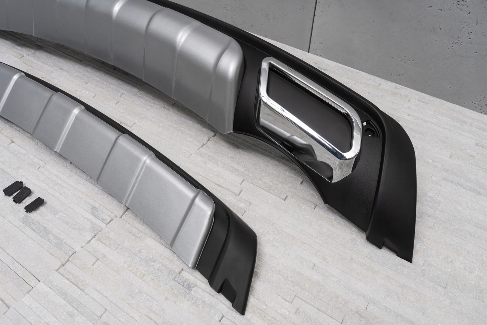 набір містить два доповнення: вперед і задню частину автомобіля. Обкладинки виготовлені з високоякісного пластику ABS, покритого чорним та срібним лаком із зовнішнім виглядом алюмінію. Додаткові імітації витяжних наконечників, які надають сильний характер, були інтегровані в спину. Межі імітації Chrome додають елементу декоративного персонажа. Набір разом з доповненнями включає монтажні елементи. Ми рекомендуємо збори в професійному семінарі.