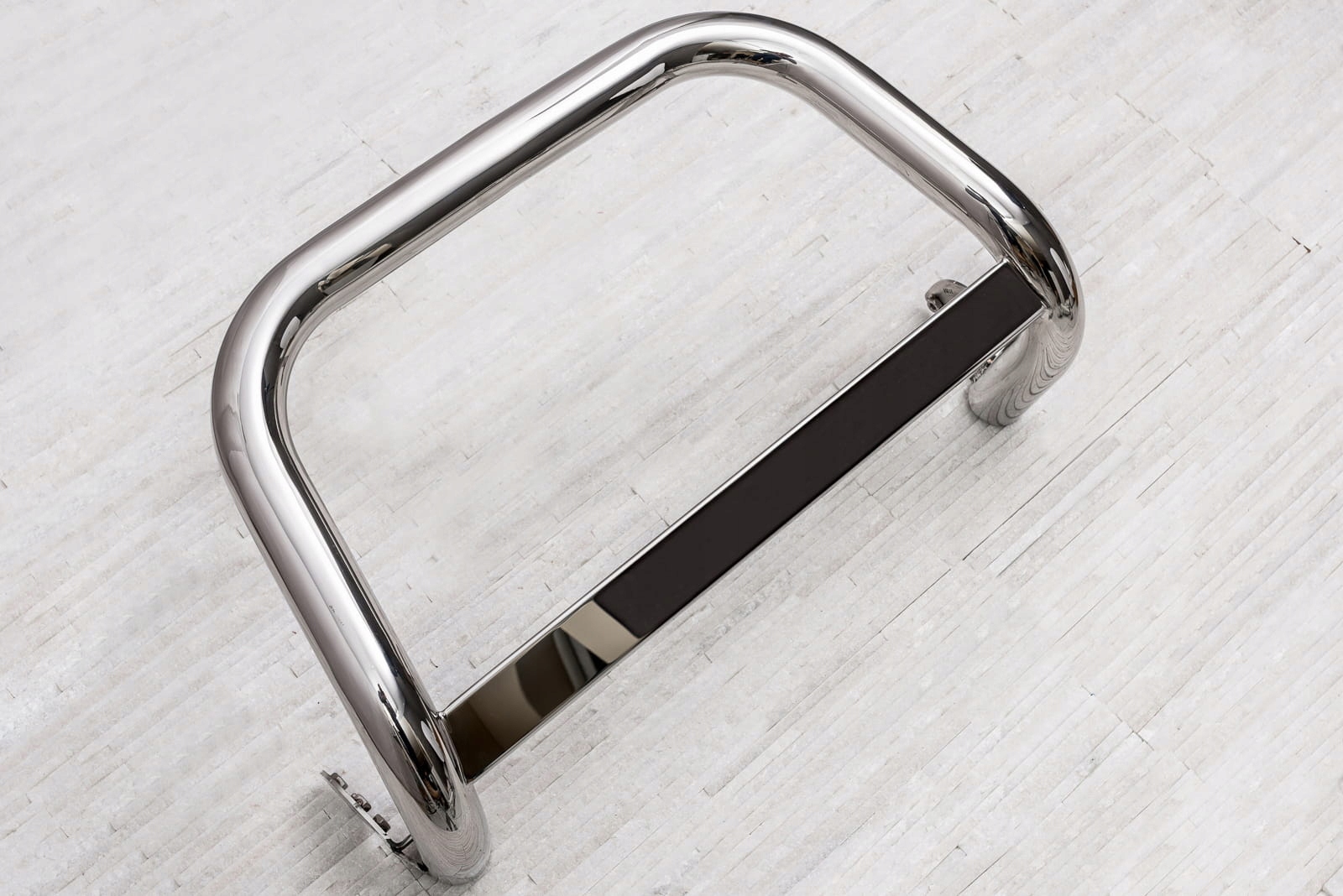 Пропонована окантовка ідеально підходить для їзди по бездоріжжю, знижуючи ризик пошкодження передньої частини автомобіля. Передні труби підкреслюють потужний зовнішній вигляд автомобіля, доповнюючи його спортивний стиль. Виріб виготовлено з високоякісної полірованої нержавіючої сталі (аустенітної, кислотостійкої, хромонікелевої сталі). Завдяки використанню високоякісного матеріалу труби не іржавіють і не змінюють колір. У комплект входить передня обшивка та елементи кріплення. Встановлення є неінвазивним відповідно до інструкцій, що додаються. Рекомендуємо професійний монтаж.