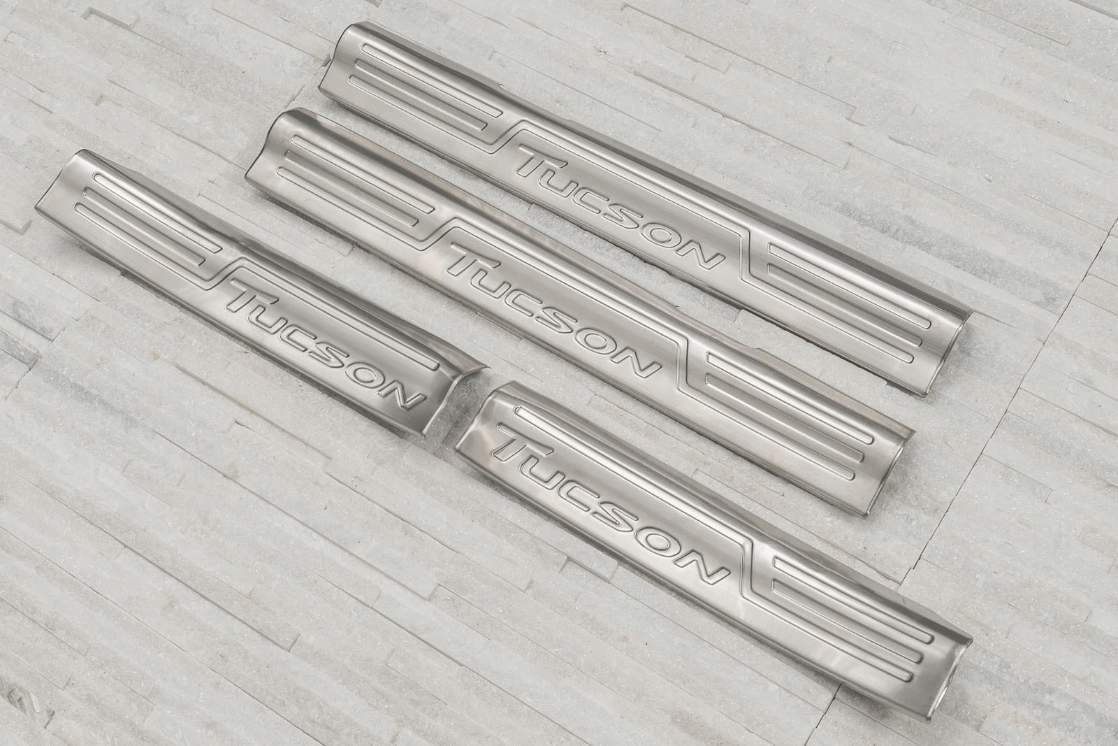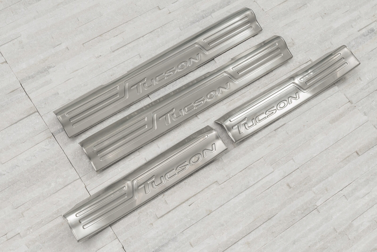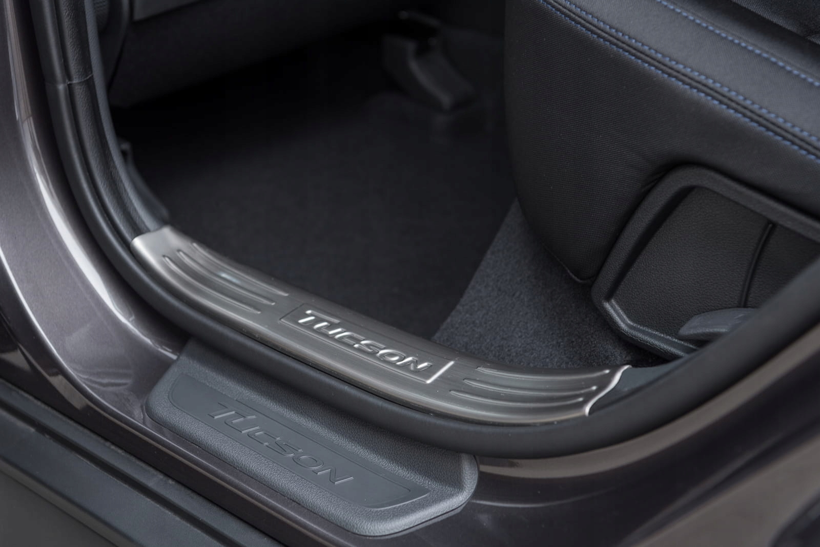 Планки кріпляться на верхні, пластикові частини внутрішніх порогів. Вони доповнюють внутрішню лінію дверей і надають поріжку спортивно-елегантний вигляд. Ця модель привертає увагу декоративним тисненим написом TUCSON, який прикрашає кожну смужку.
