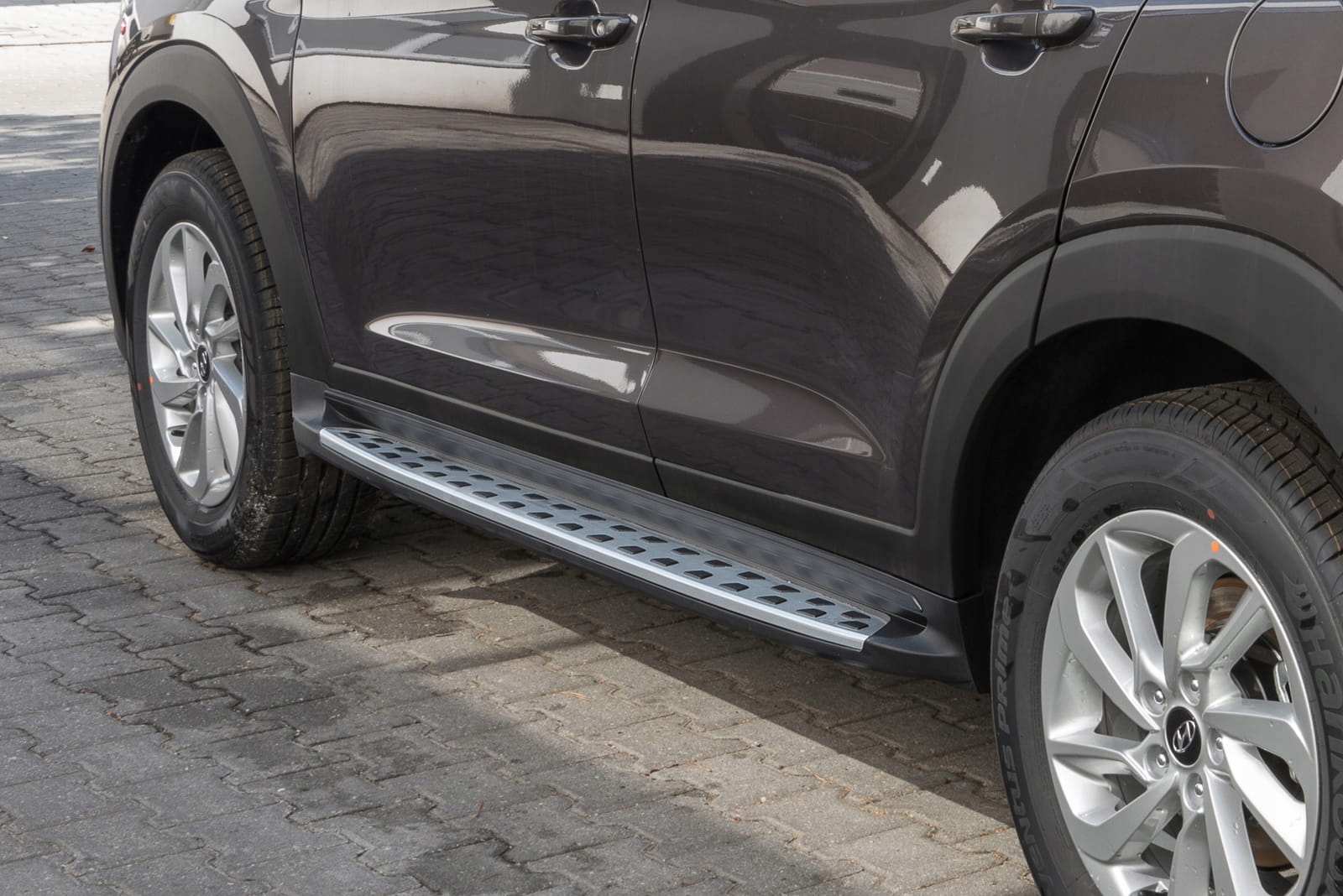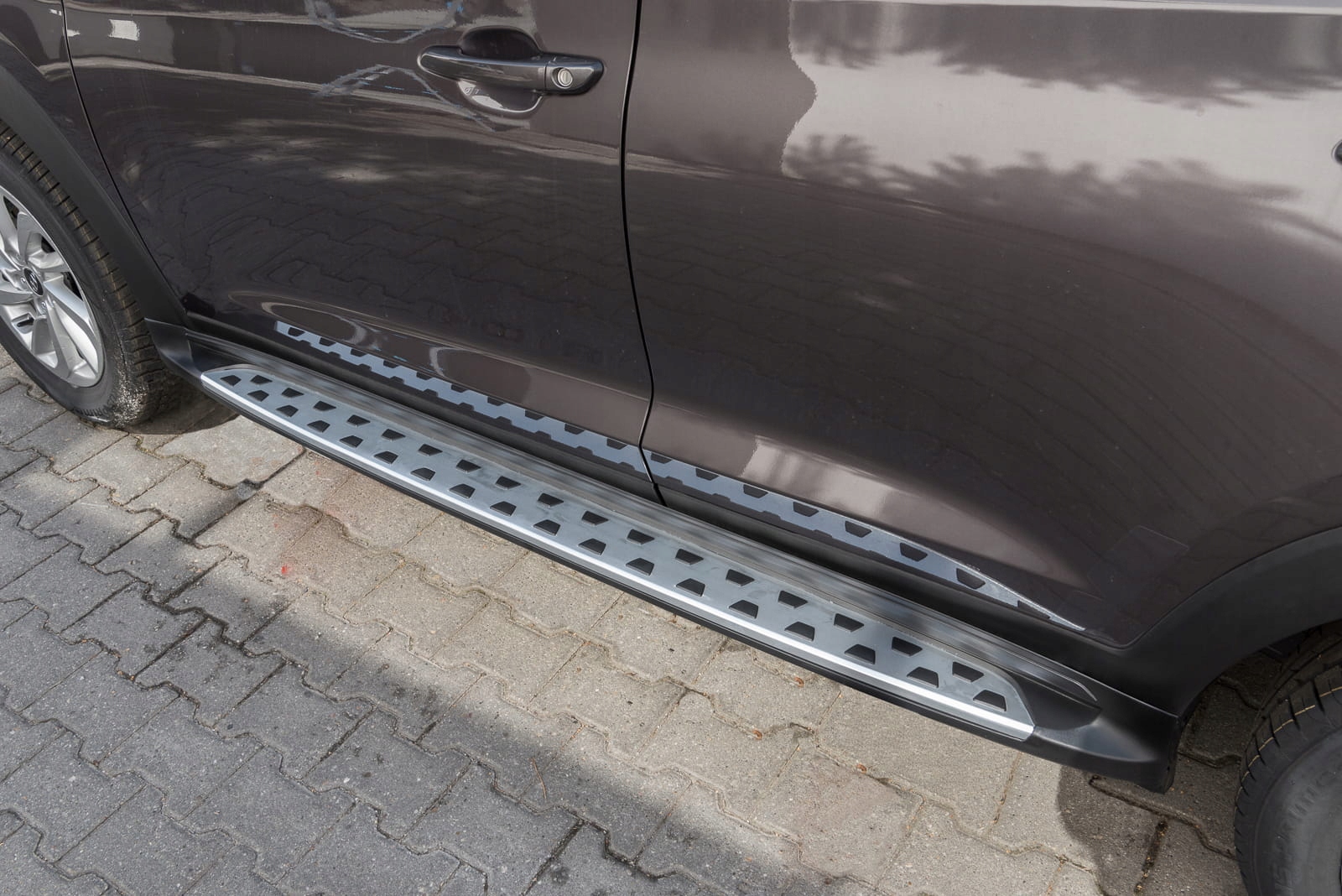 Бічні підніжки, пороги, присвячені HYUNDAI TUCSON III (TL) 2015+ модель. Порогові значення, оформлені як версії OEM (OEM STYLE).