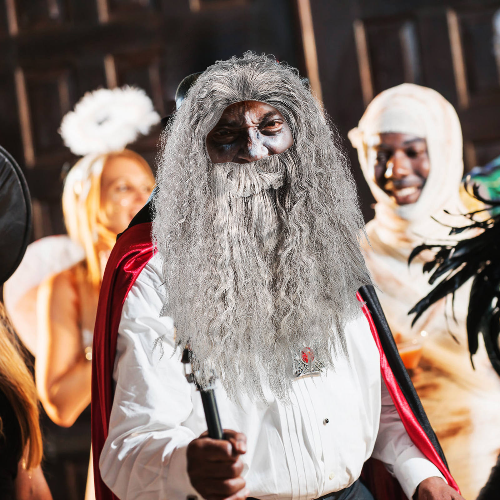 🌈 🌈 Хочете бути в центрі уваги на вечірці на Хеллоуїн чи косплей? Подивіться на цей продукт. Наш продукт - це довгий набір підборіддя. Він м'який, зручний і дихаючий. Ця перука Майстра та Борода - це чудове доповнення, яке дасть вашому костюму майстра додатковий акцент.