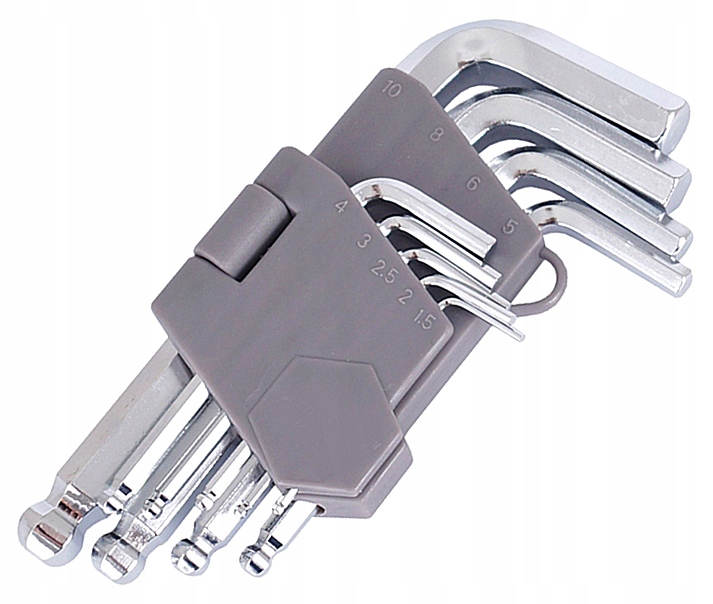 Набір з 9 шестигранних ключів із хромованадієвої сталі.