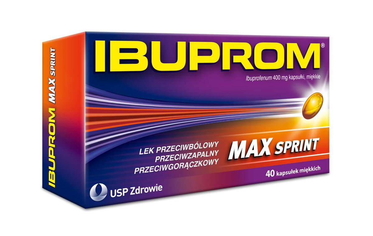 Препарат ібупром макс спринт, у формі м'яких капсул, для застосування при болях: головний біль, мігрень, зуби, м'язи, кістки, суглоби. Препарат має болезаспокійливу, протизапальну та жарознижуючу дію. Він містить ібупрофен, який відноситься до нестероїдних протизапальних засобів (НПЗП).