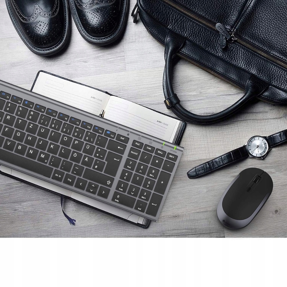 алюмінієва конструкція та високоякісна пластик ABS надають клавіатурі сучасний вигляд, який ідеально відповідає кожному пристрою. Світло і тонка форма робить клавіатуру ультра-легким, ідеально підходить для роботи в будь-якому місці. зручність написання, усунення неприємних відчуттів. Механізм ножиць клавіш забезпечує тиху і точну роботу, збільшуючи комфорт використання. з'єднання з діапазоном 10 метрів. Клавіатура не потребує складного випаровування і працює відразу після підключення. 280 мАг дозволяє до 90 годин роботи на одній зарядці, що займає лише 2 години. Миша вимагає двох акумуляторів AAA (не включається).