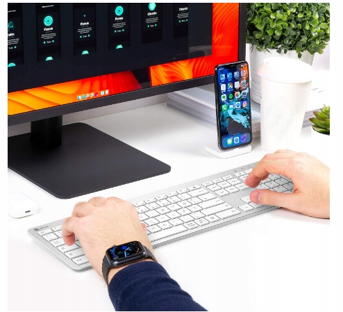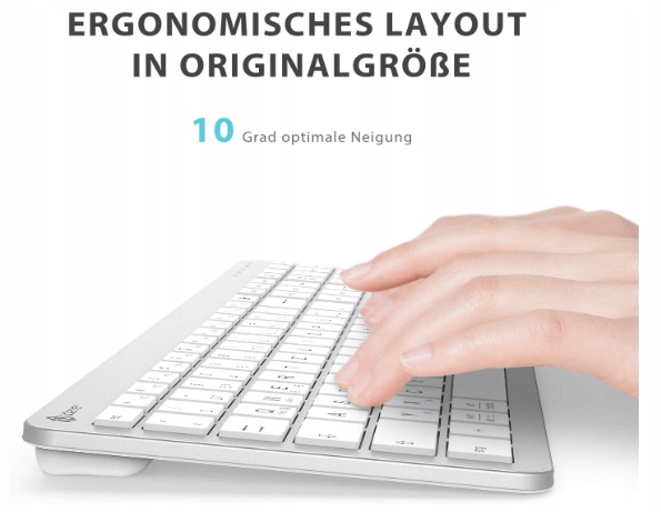 - Повнорозмірний і ергономічний дизайн. Ця бездротова клавіатура забезпечує повну розкладку клавіатури для будь-якого типу набору тексту. Його тонкий профіль і невелика вага забезпечують мало місця на вашому столі. Клавіатура оснащена ніжкою, яка тримає її під оптимальним нахилом і запобігає болю в зап'ясті під час тривалого набору тексту. Клавіші захищені від бризок, тому біла клавіатура захищена від нещасних випадків, пов’язаних із кавою.