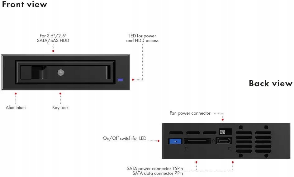 Відсік IB-129SSK-B для жорстких дисків 3,5\"/2,5\" SATA/SAS; Особливості: - Відсік для диска 3,5\"/2,5\" - Підтримує всі диски 3,5\"/2,5\" SATA/SAS 1,5/3,0/6,0 Гбіт/с (висота 1\"); - Встановлення у відсік 5,25\"; - Спеціальний алюмінієвий корпус, що забезпечує чудову тепловіддачу; - Підтримує гарячу заміну; - Замок захищає від несанкціонованого доступу; - Конструкція без вентилятора забезпечує тиху роботу; - Роз'єм живлення 12 В для додаткового вентилятора. Алюміній має функцію пасивного теплообміну. Алюміній охолодження; Мобільна кишеня IB-129SSK-B має ефективну пасивну систему охолодження. Алюмінієвий корпус дуже добре розсіює тепло, що забезпечує тиху та стабільну роботу без необхідності установки вентилятора. Без медіа = вдвічі швидше; Завдяки тому, що нам не потрібно монтувати жорсткий диск на будь-якому корпусі, а безпосередньо на відсіку, встановлення відбувається абсолютно без інструментів. Завдяки цьому ми можемо економити вдвічі більше часу. Єдине, що потрібно, це відсік 5,25 дюйма. Він підтримує жорсткі диски SATA на швидкостях SATA I, II і III. Відсутність вентилятора = тиха робота; Наша кишеня повністю виготовлена з алюмінію, передня та задня частини кишені (кріпильна частина) виготовлені з твердого пластику для забезпечення повного захисту. Алюміній дуже міцний, хоча він дуже легкий. Головна особливість алюмінію полягає в тому, що він чудово розсіює тепло, роблячи пристрій Не хвилюйтеся = заблоковано! Щоб сторонні особи не мали доступу до ваших даних, ми надаємо інформацію про доступ до жорсткого диска.