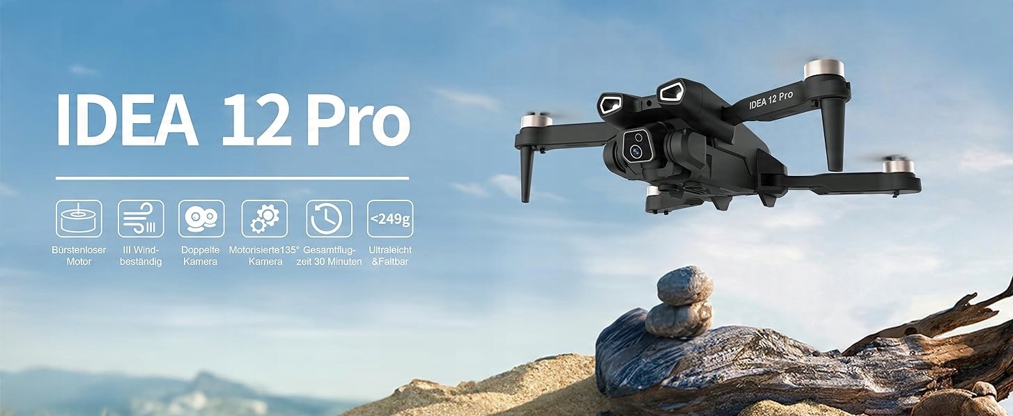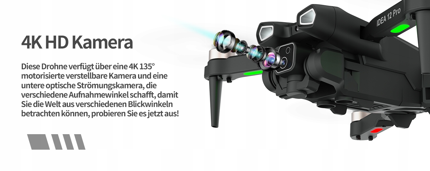 - Камера 4K HD і ESC: дрон IDEA12 PRO оснащено камерою 4K UHD. Він забезпечує зображення високої роздільної здатності та дозволяє досліджувати ландшафти за допомогою дрона. Камера з електричним регулюванням на 135° звільняє ваші руки, тому ви можете будь-коли змінити орієнтацію та дивитися на світ під різними кутами.